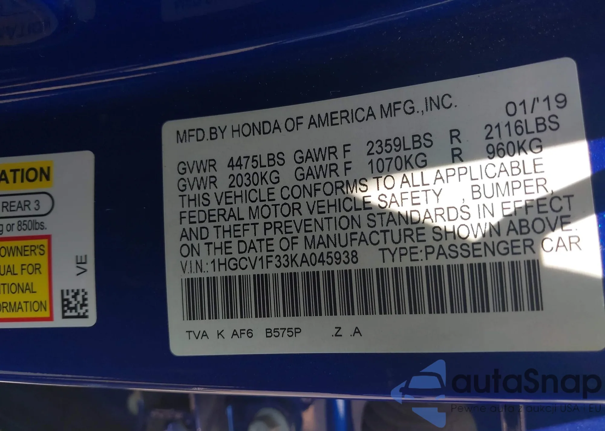 • VIN 1HGCV1F33KA045938