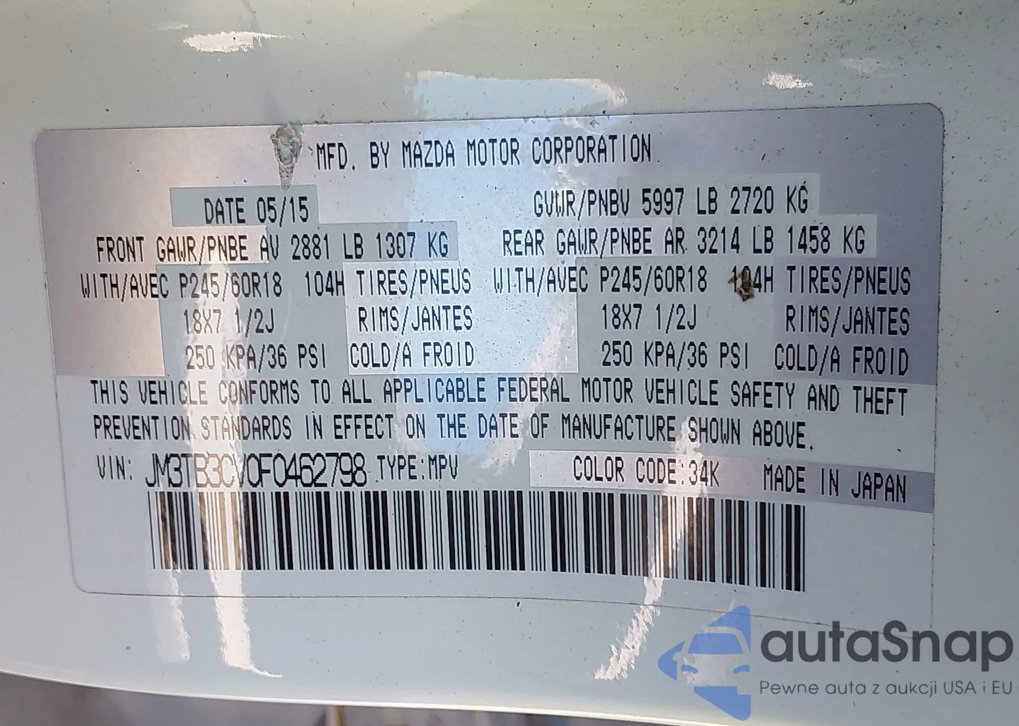 LOT: 43053851 VIN: JM3TB3CV0F0462798
