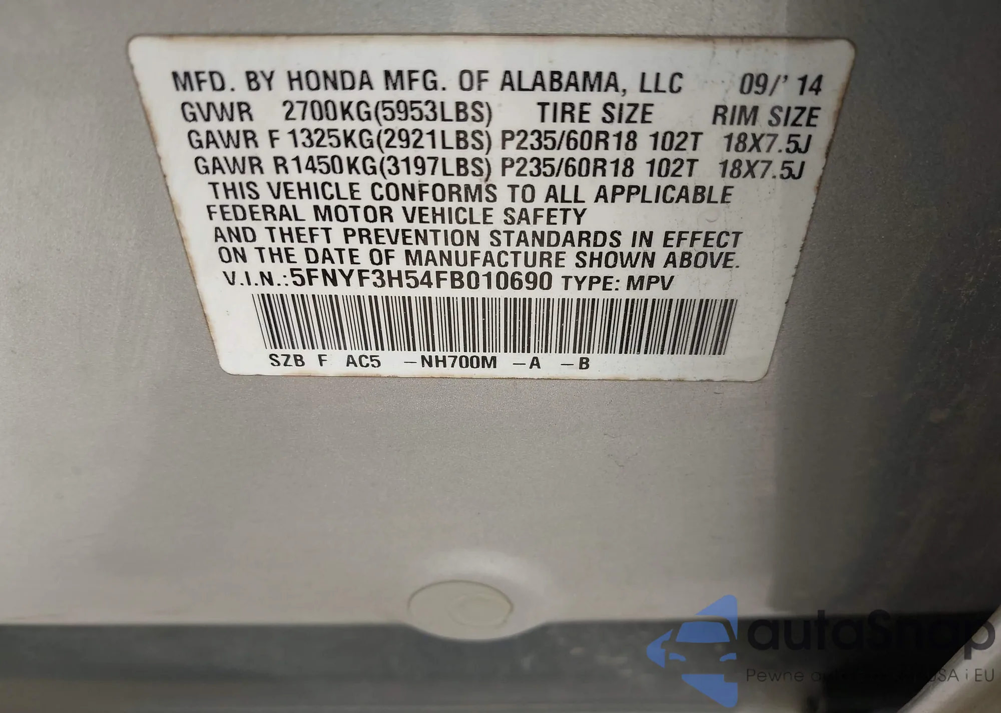 LOT: 42736548 VIN: 5FNYF3H54FB010690