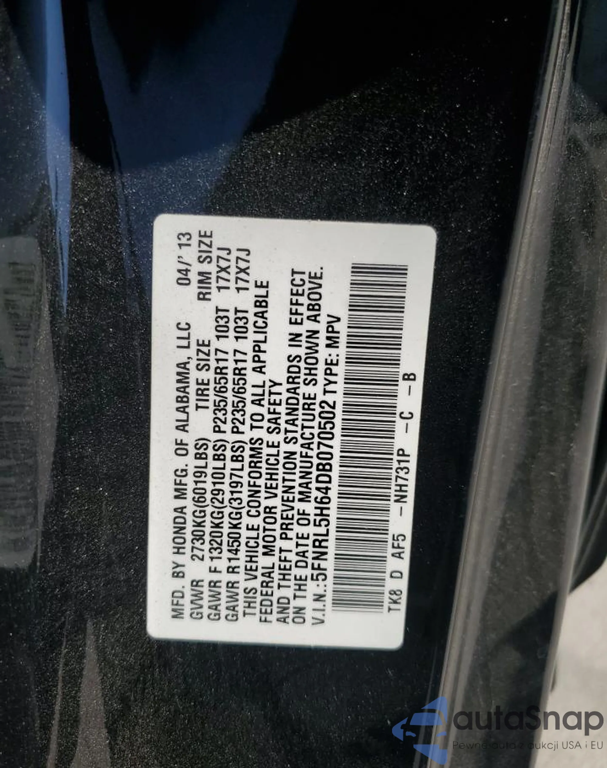 • VIN 5FNRL5H64DB070502