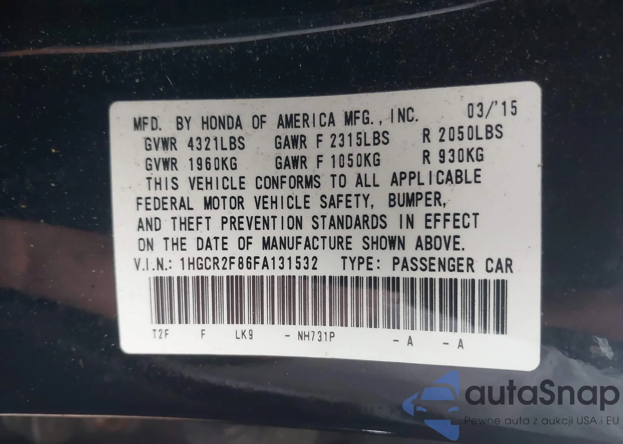 LOT: 42667115 VIN: 1HGCR2F86FA131532