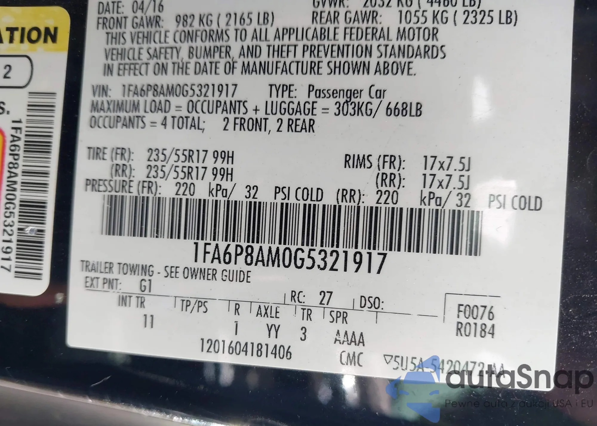 LOT: 42972343 VIN: 1FA6P8AM0G5321917
