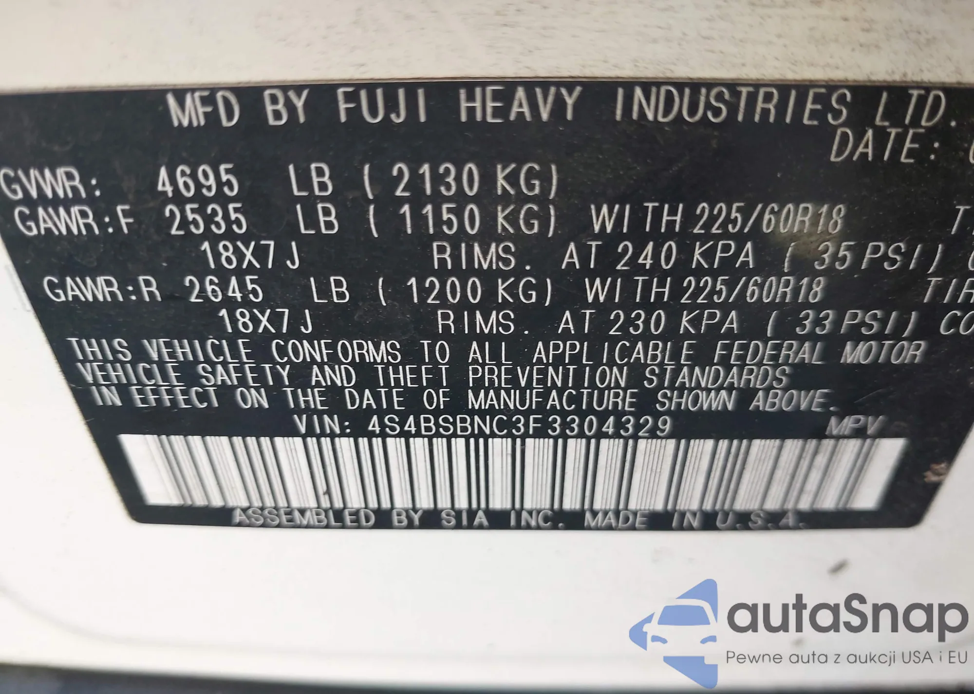 • VIN 4S4BSBNC3F3304329
