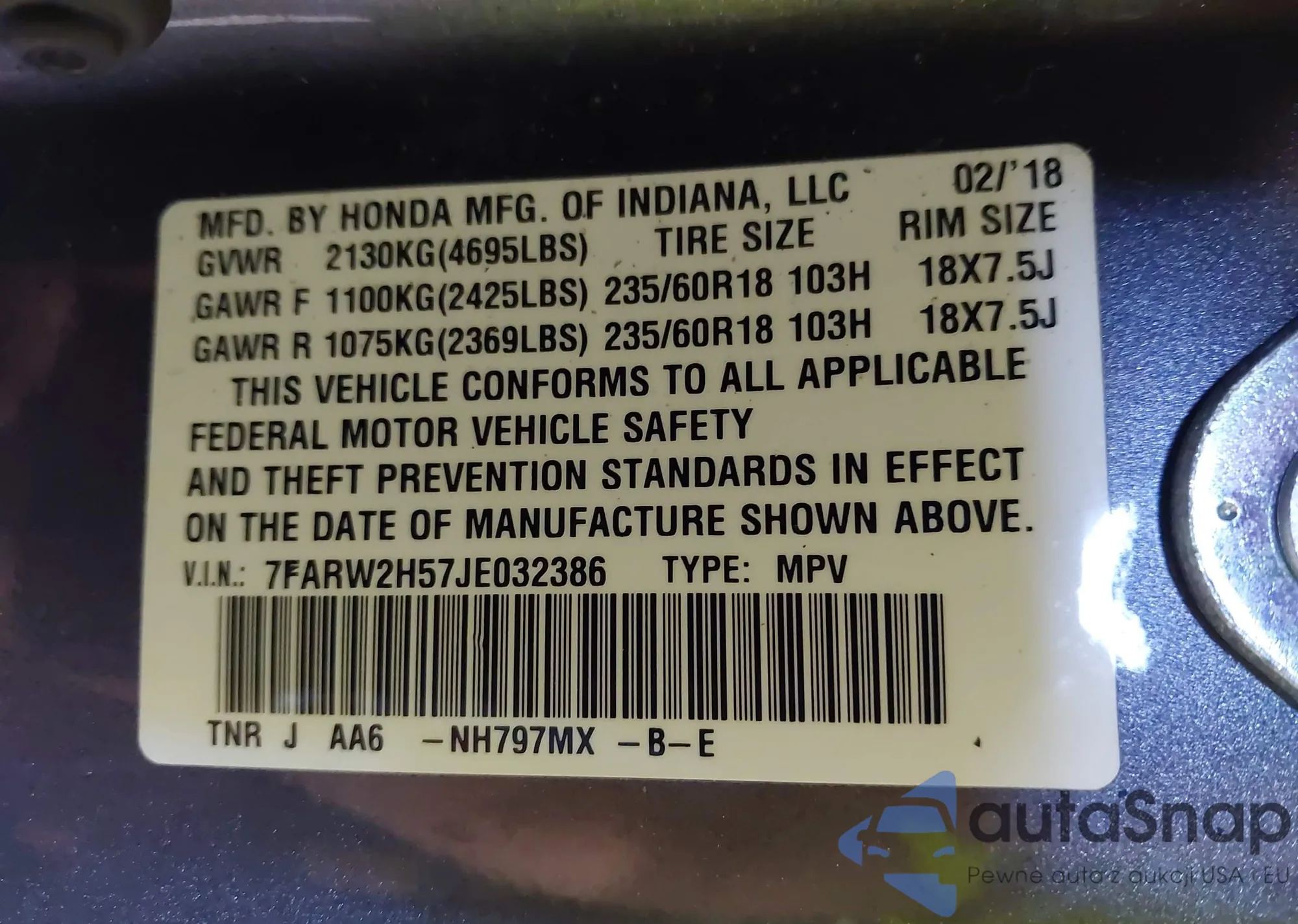 • VIN 2HKRW6H33JH231356