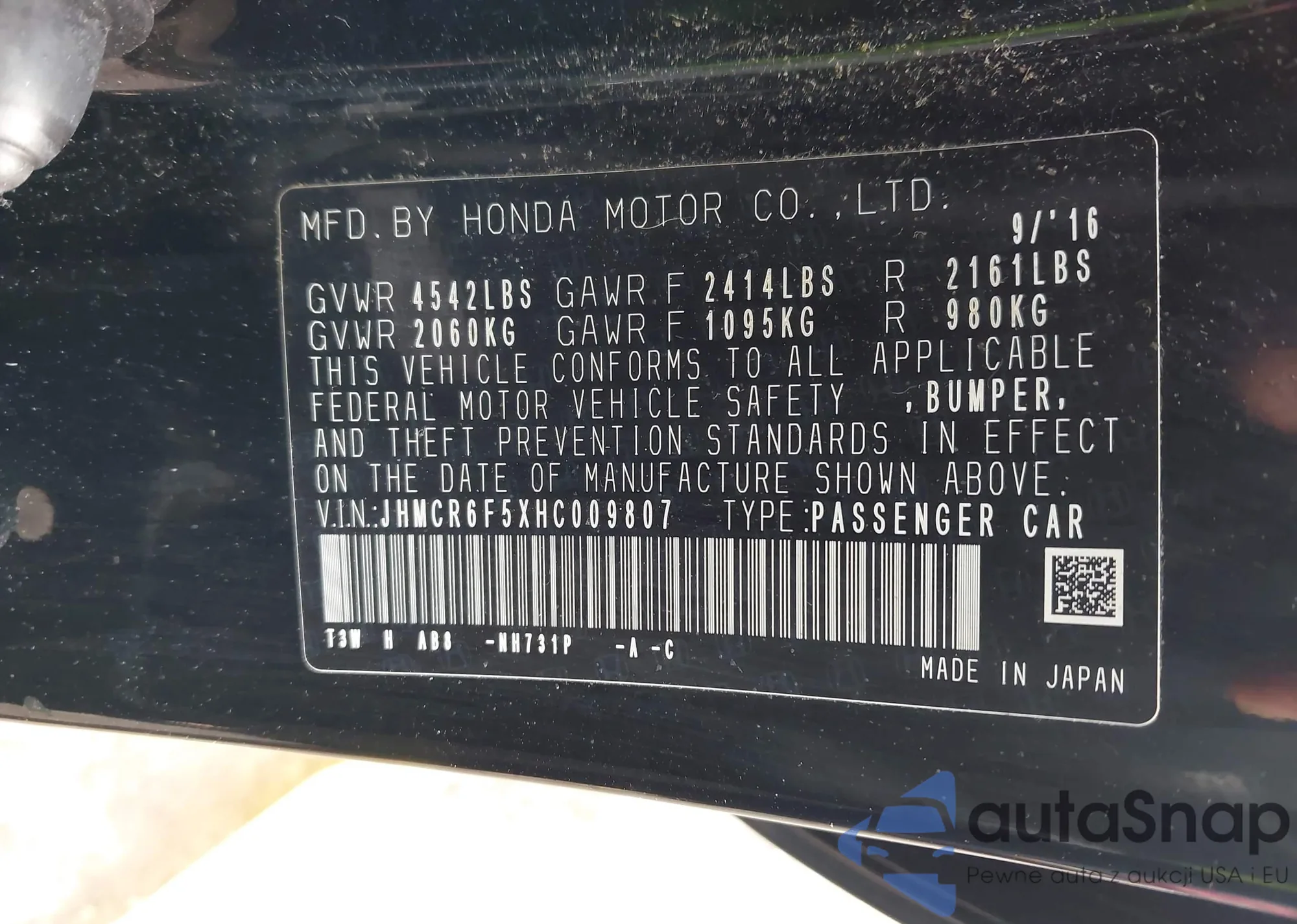 • VIN 2HKRW1H96MH406646
