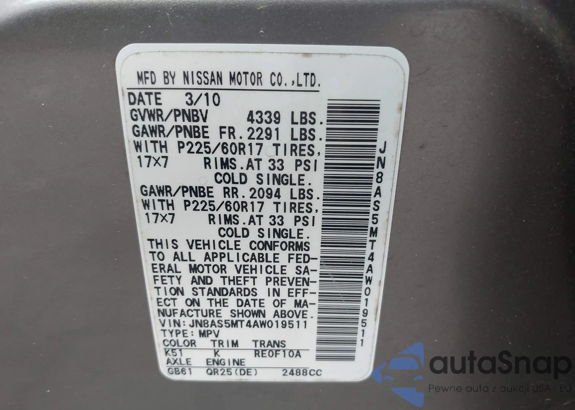 LOT: 42904239 VIN: WP0AA2A75CL013158