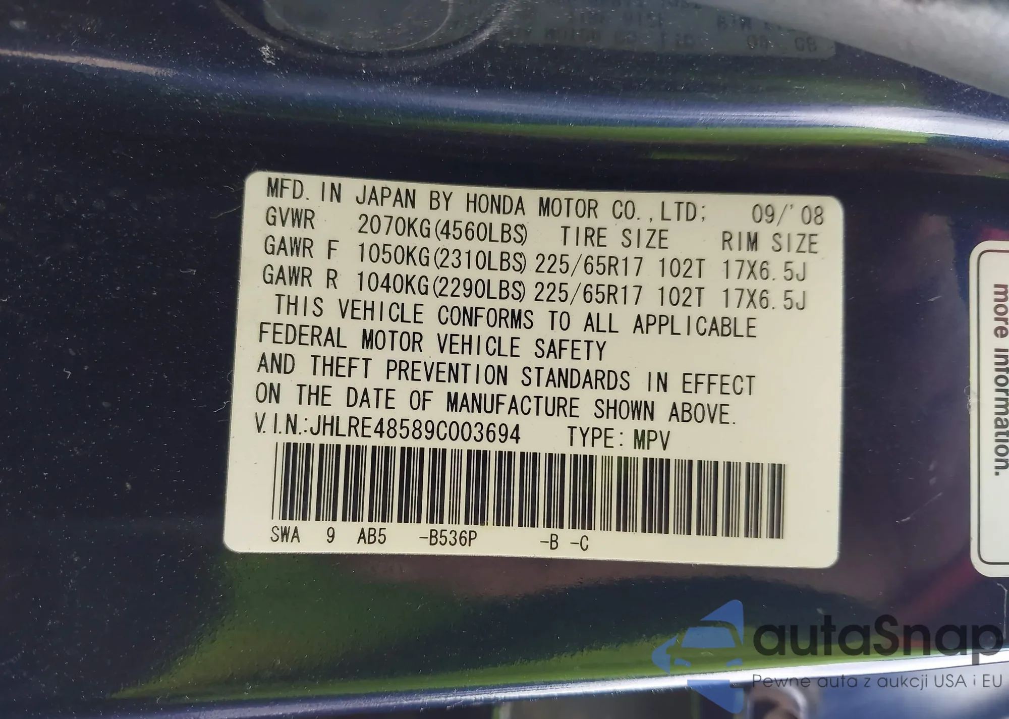 LOT: 42040005 VIN: JHLRE48589C003694