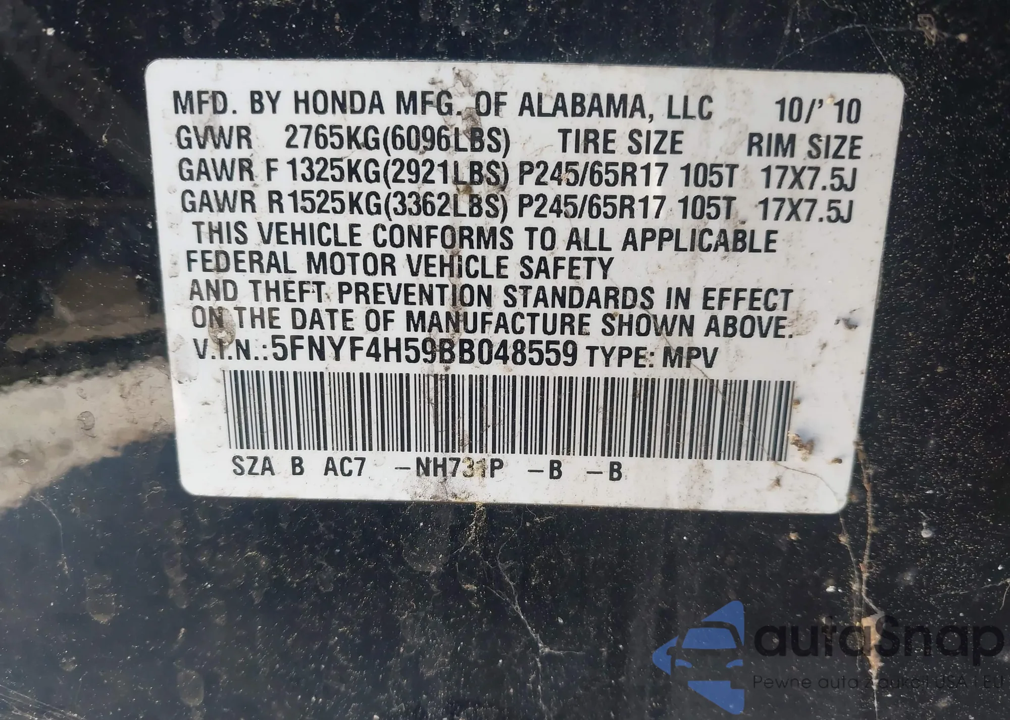 • VIN 5FNYF4H59BB048559