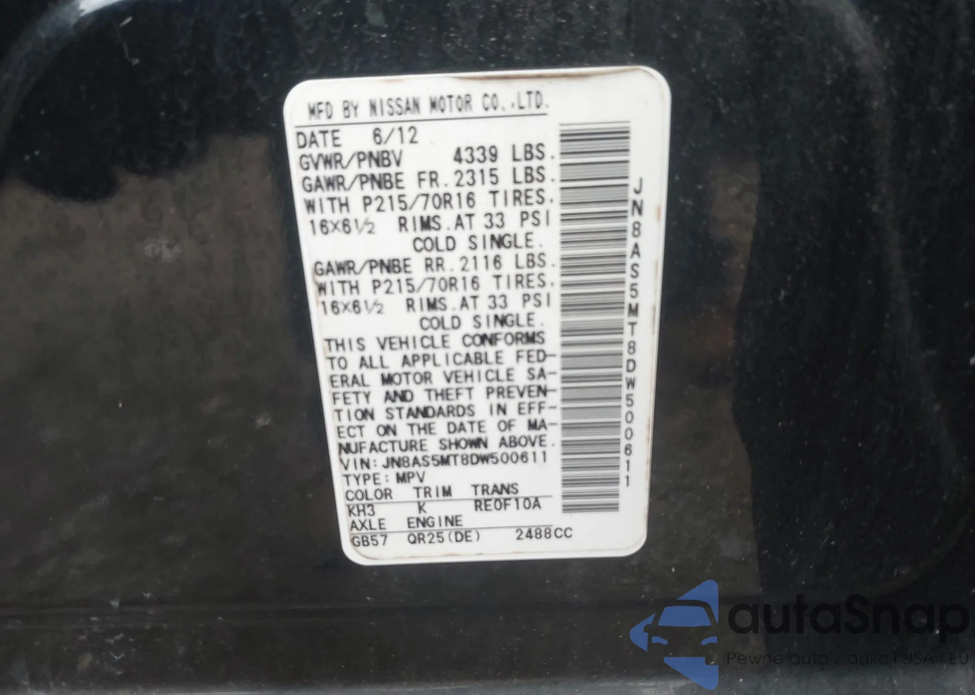 LOT: 42269011 VIN: JN8AS5MT8DW500611