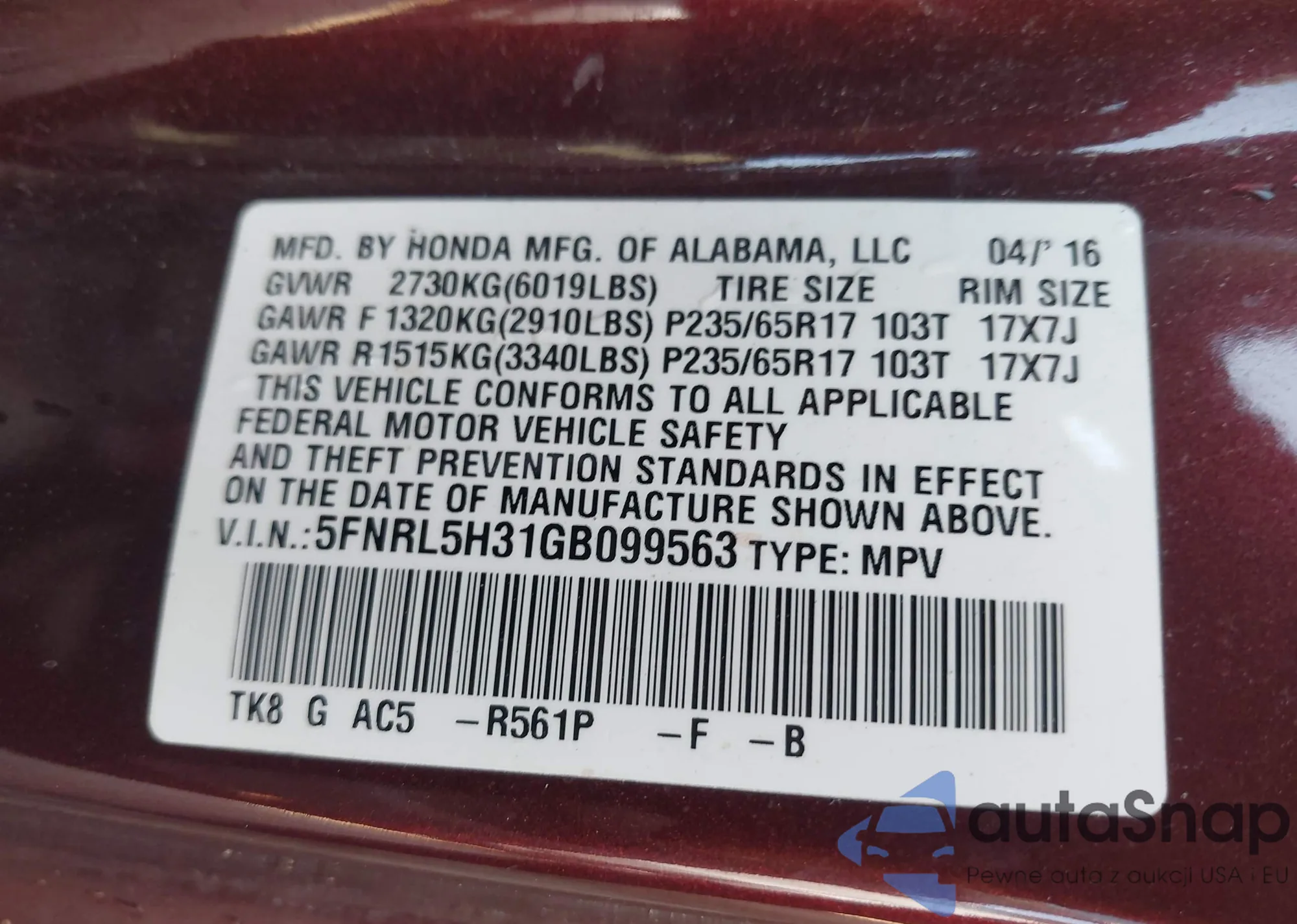 • VIN 5FNRL5H31GB099563