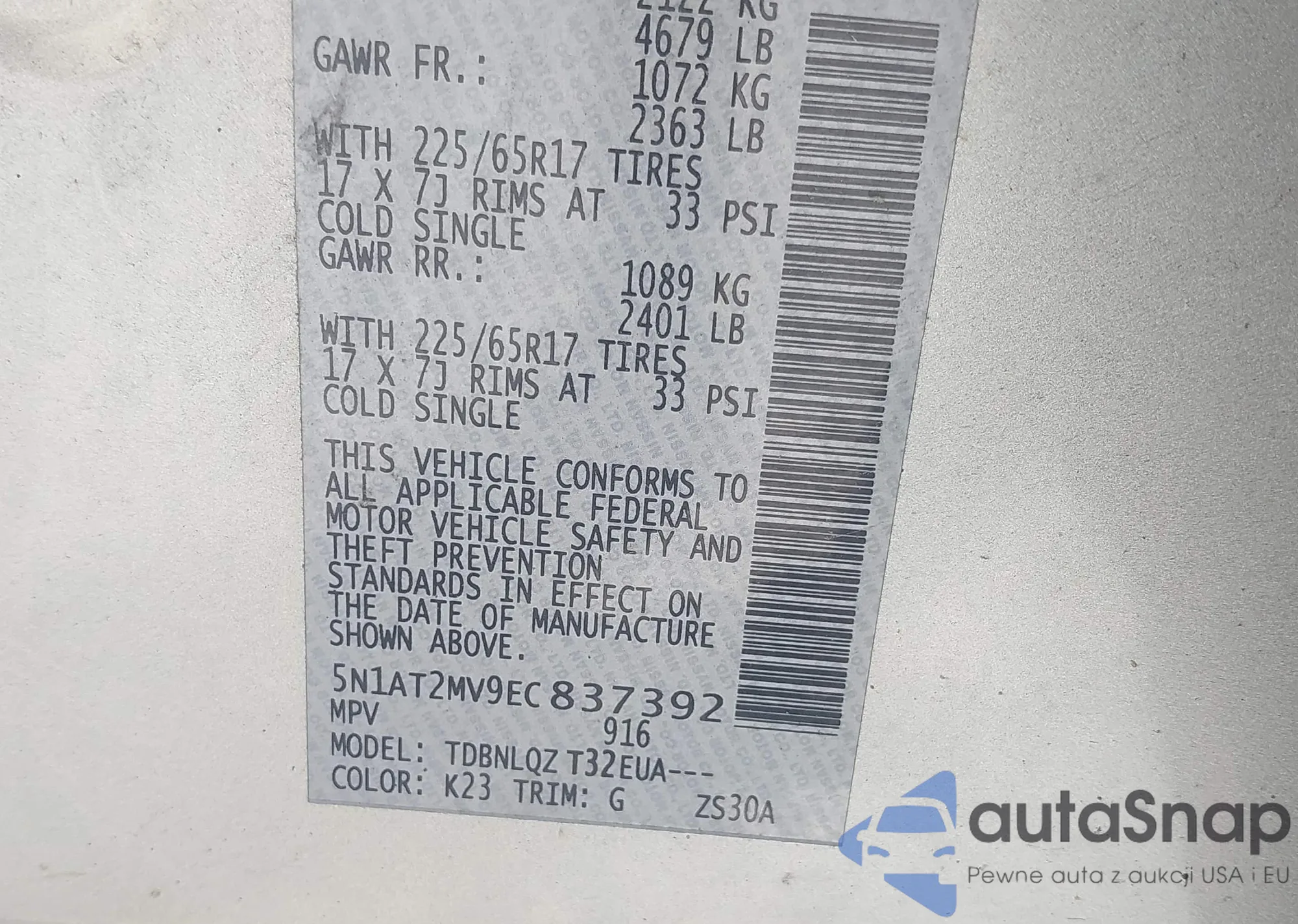 LOT: 42963711 VIN: 5N1AT2MV9EC837392