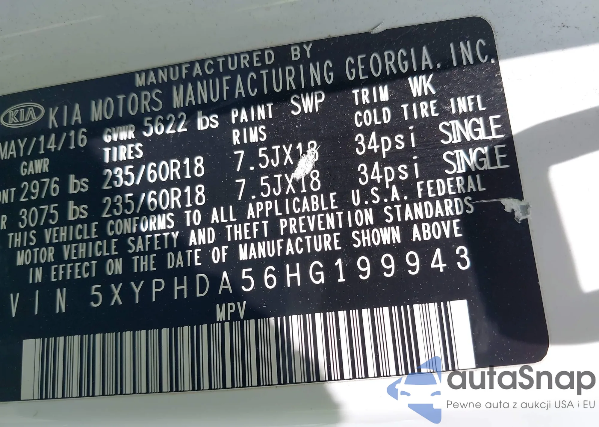 LOT: 42730974 VIN: 5XYPHDA56HG199943