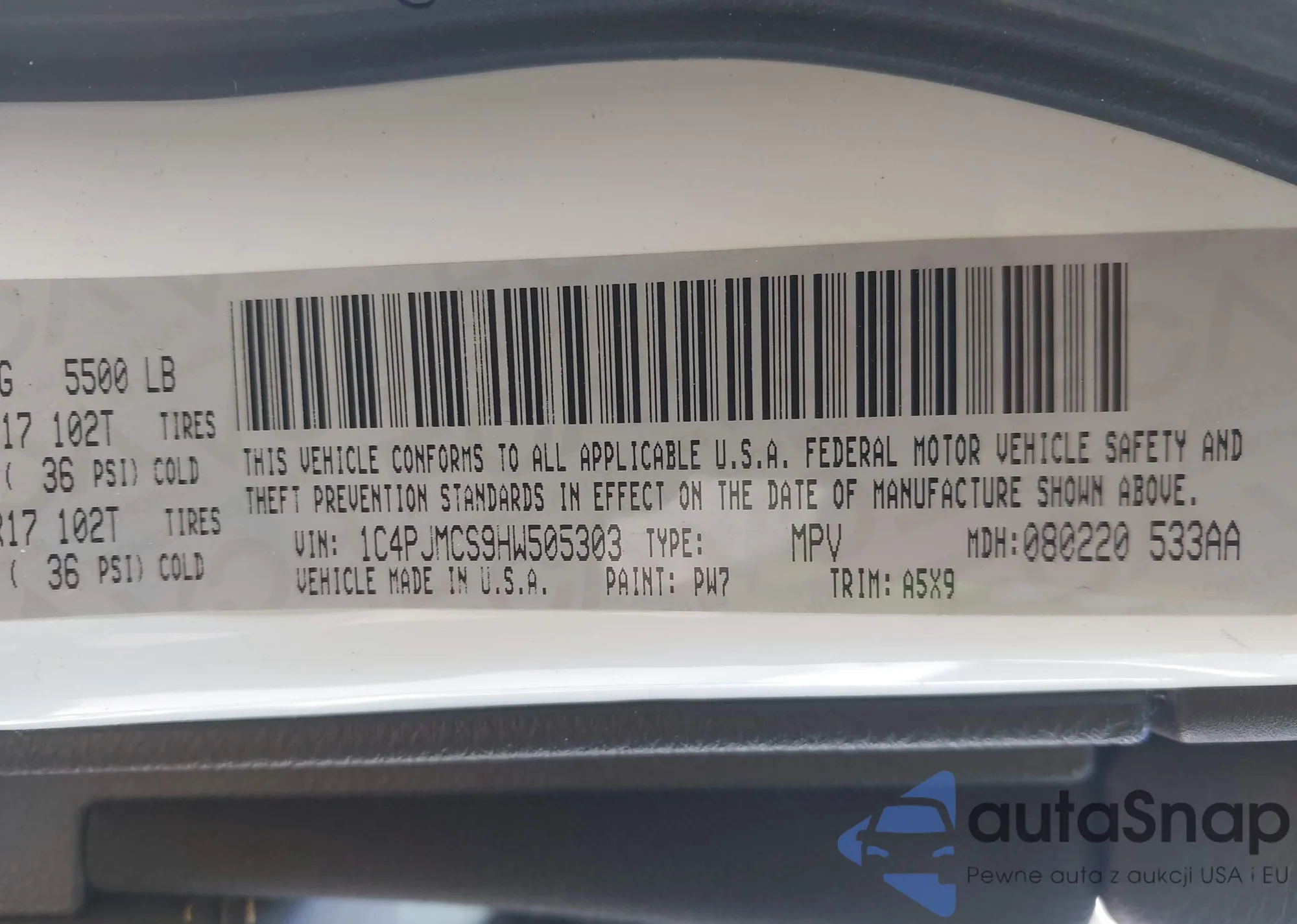 LOT: 42461716 VIN: 1C4PJMCS9HW505303