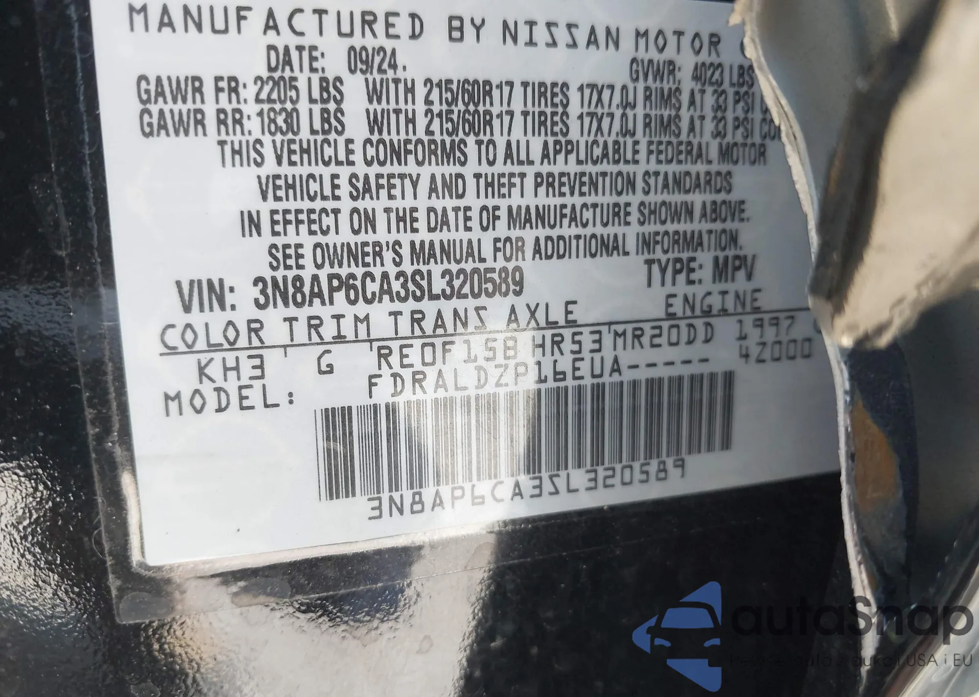 • VIN 3N8AP6CA3SL320589