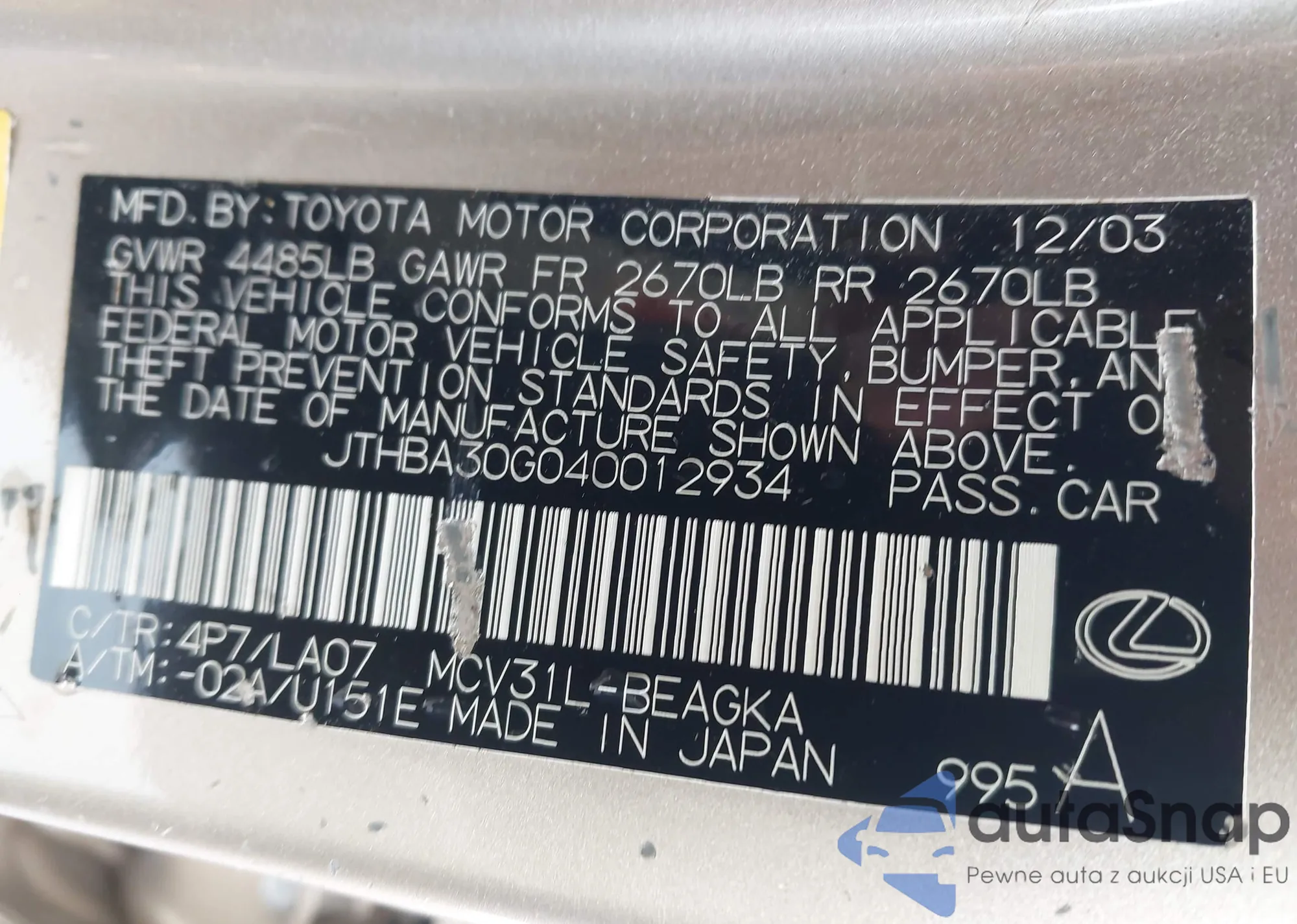LOT: 42942918 VIN: JTHBA30G040012934