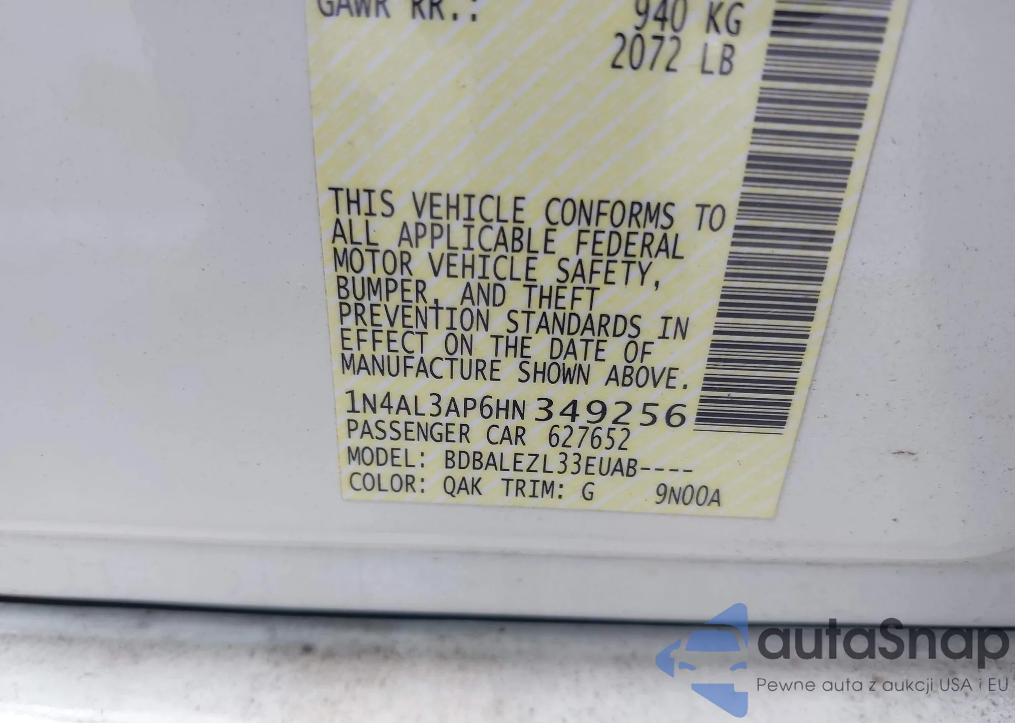 • VIN 1N4AL3AP6HN349256