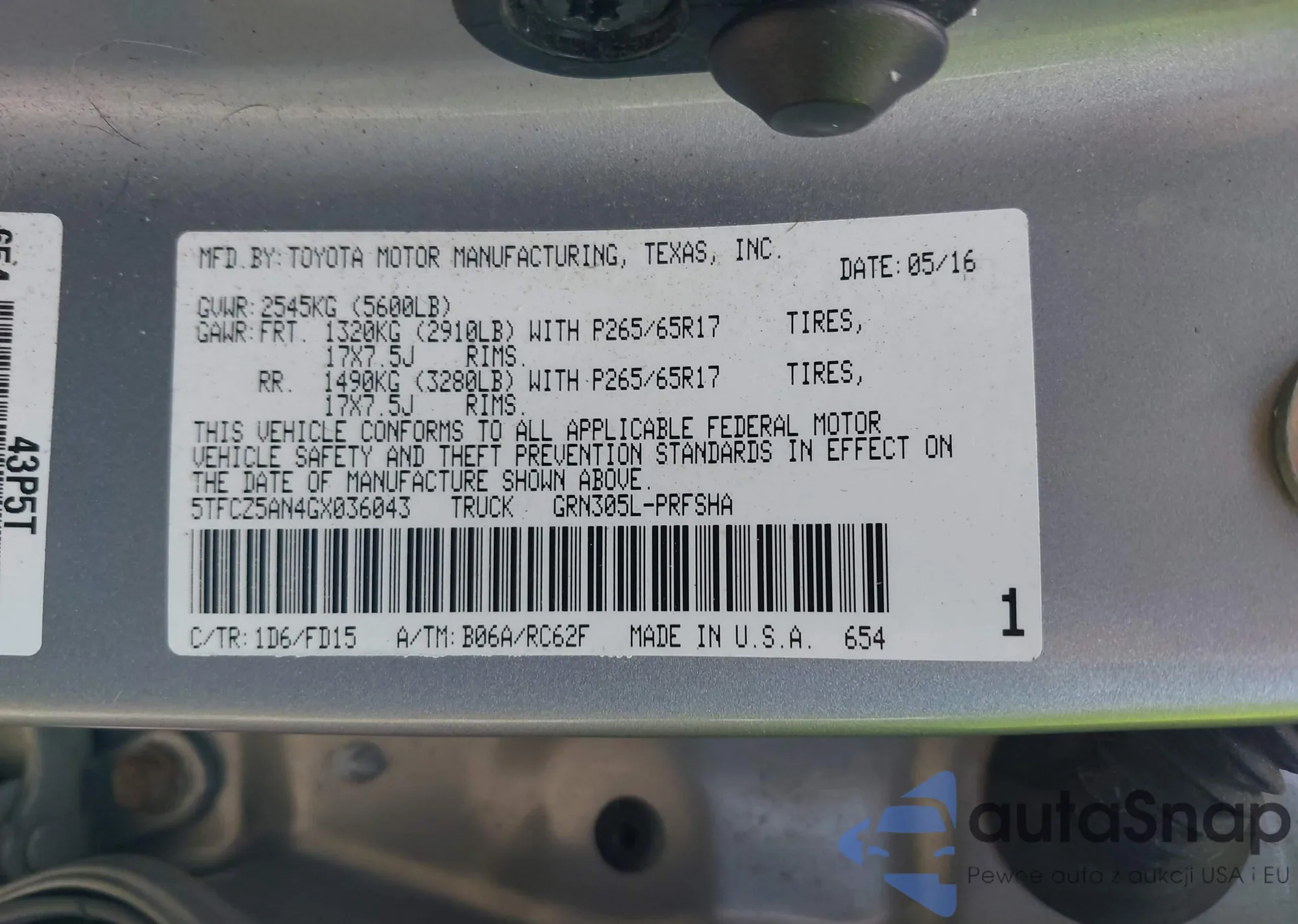 • VIN 5TFCZ5AN4GX036043