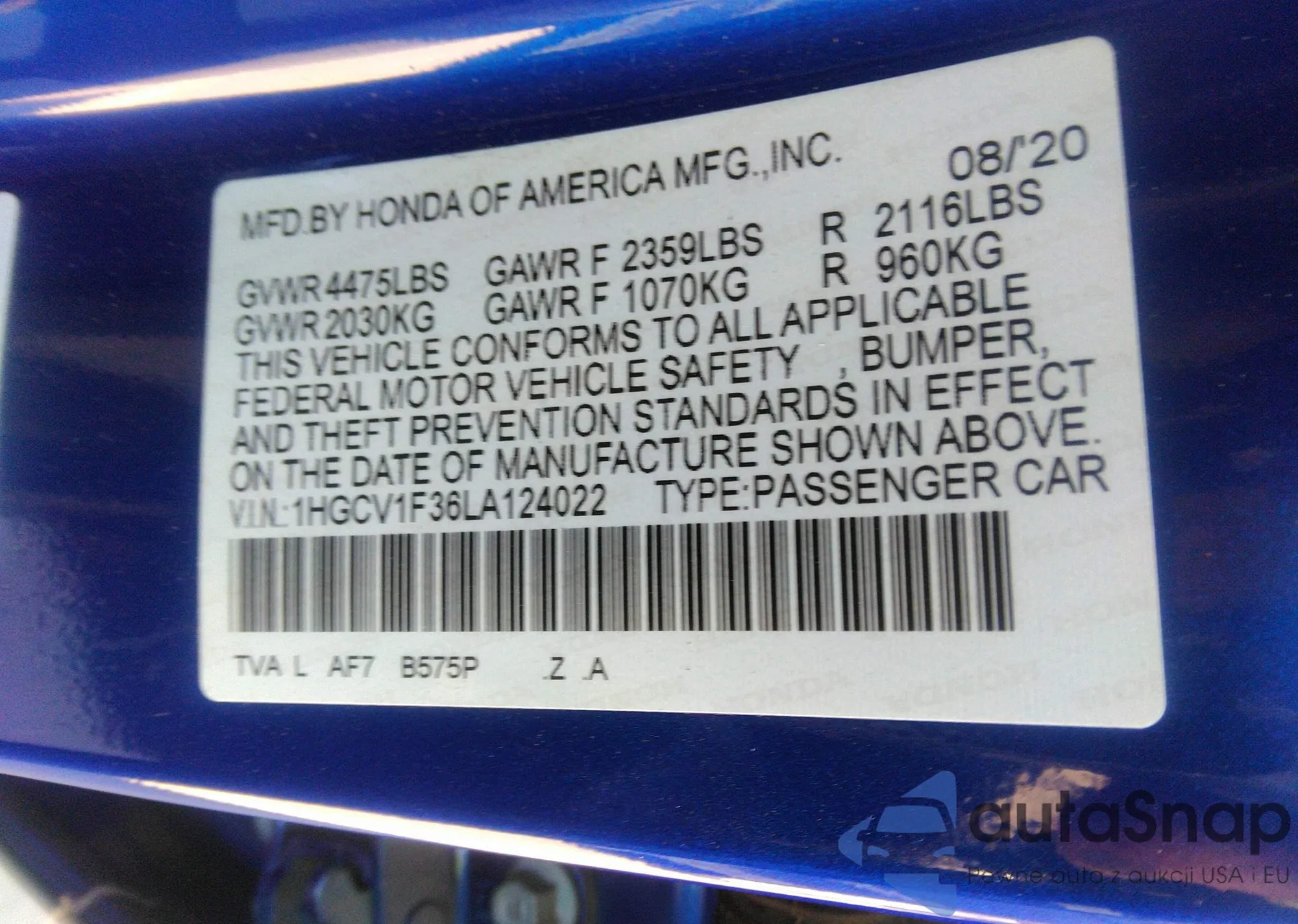 • VIN 1HGCV1F36LA124022