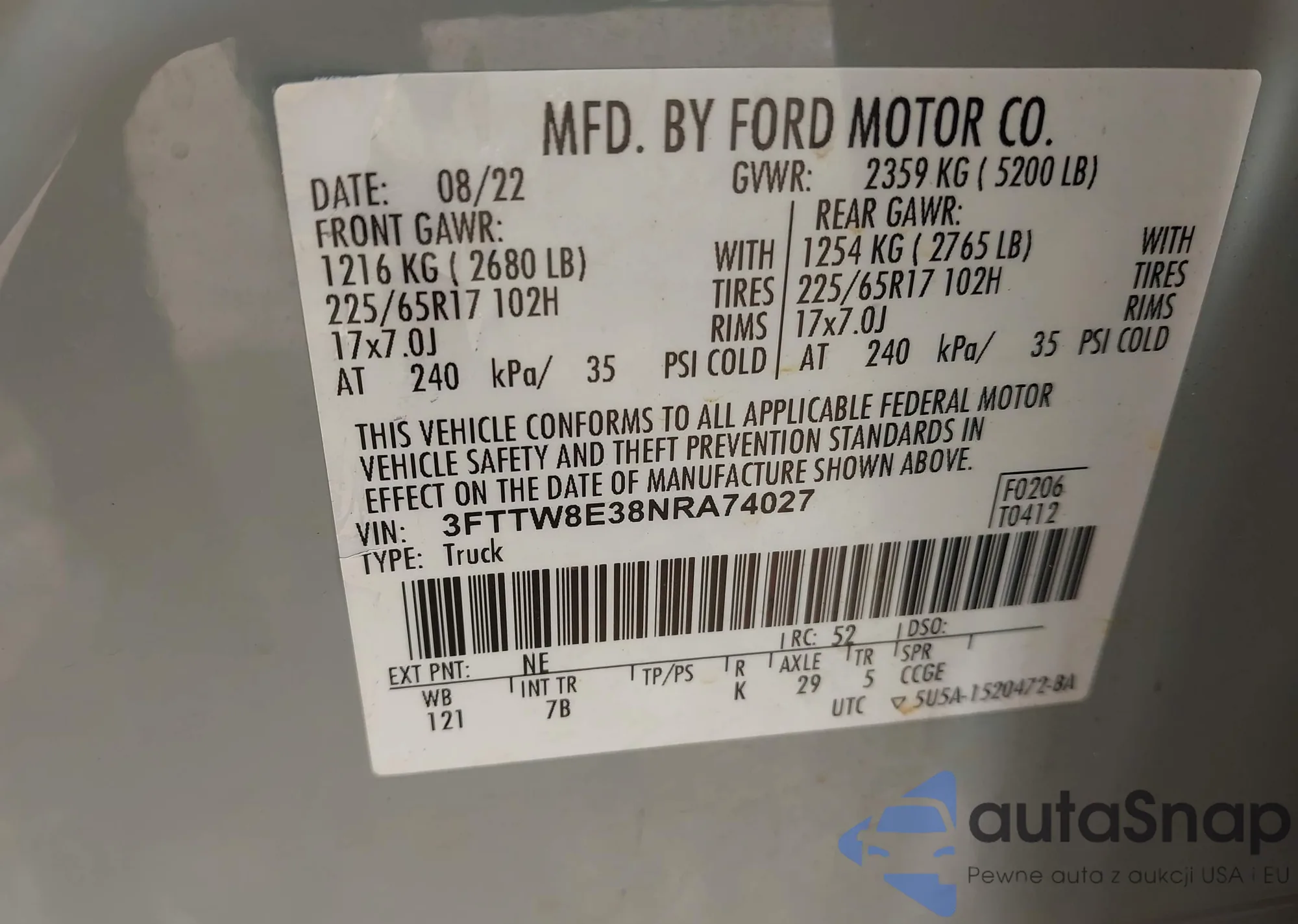 LOT: 37967644 VIN: 2FABP7BV2BX176323
