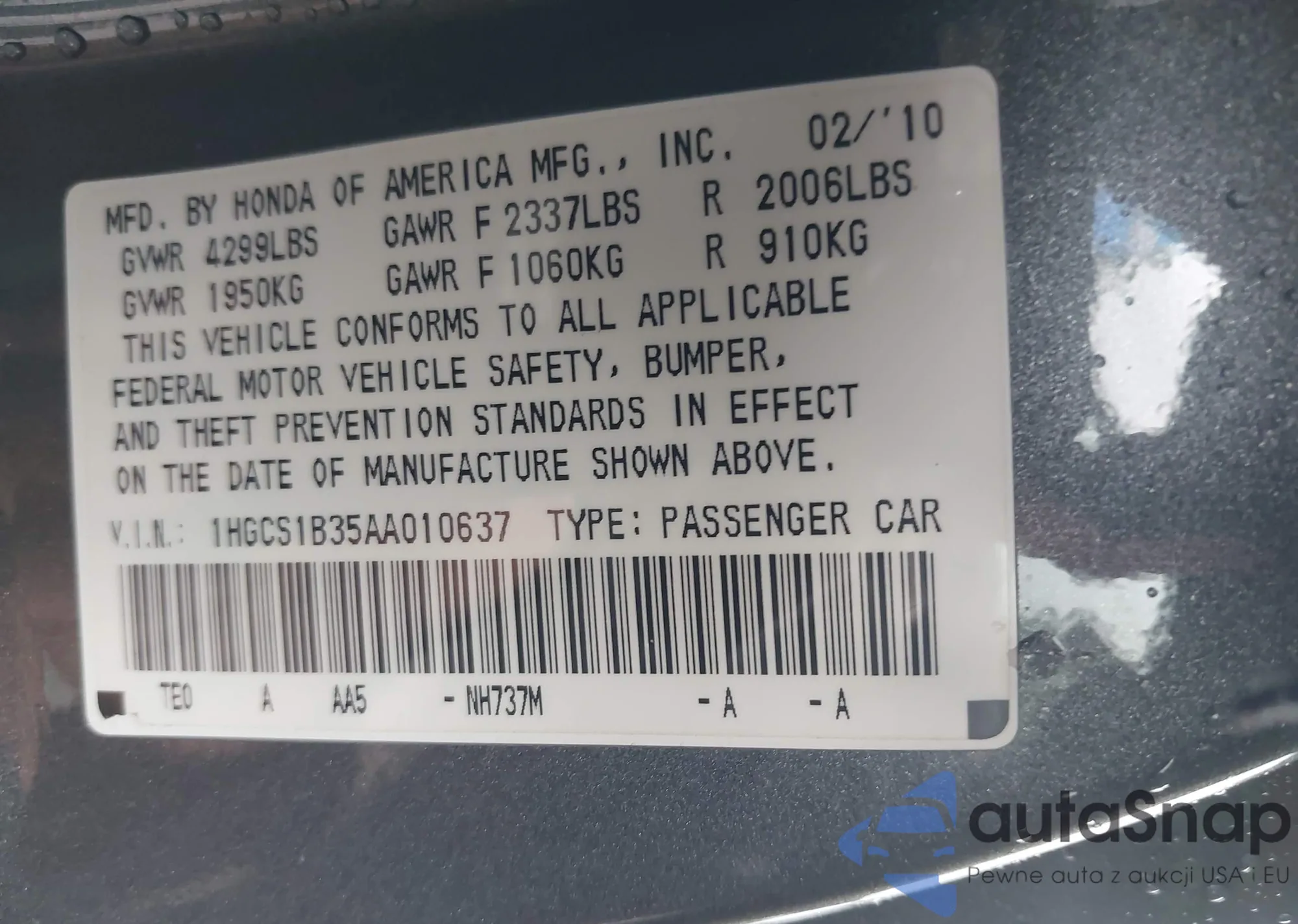 • VIN 1HGCS1B35AA010637