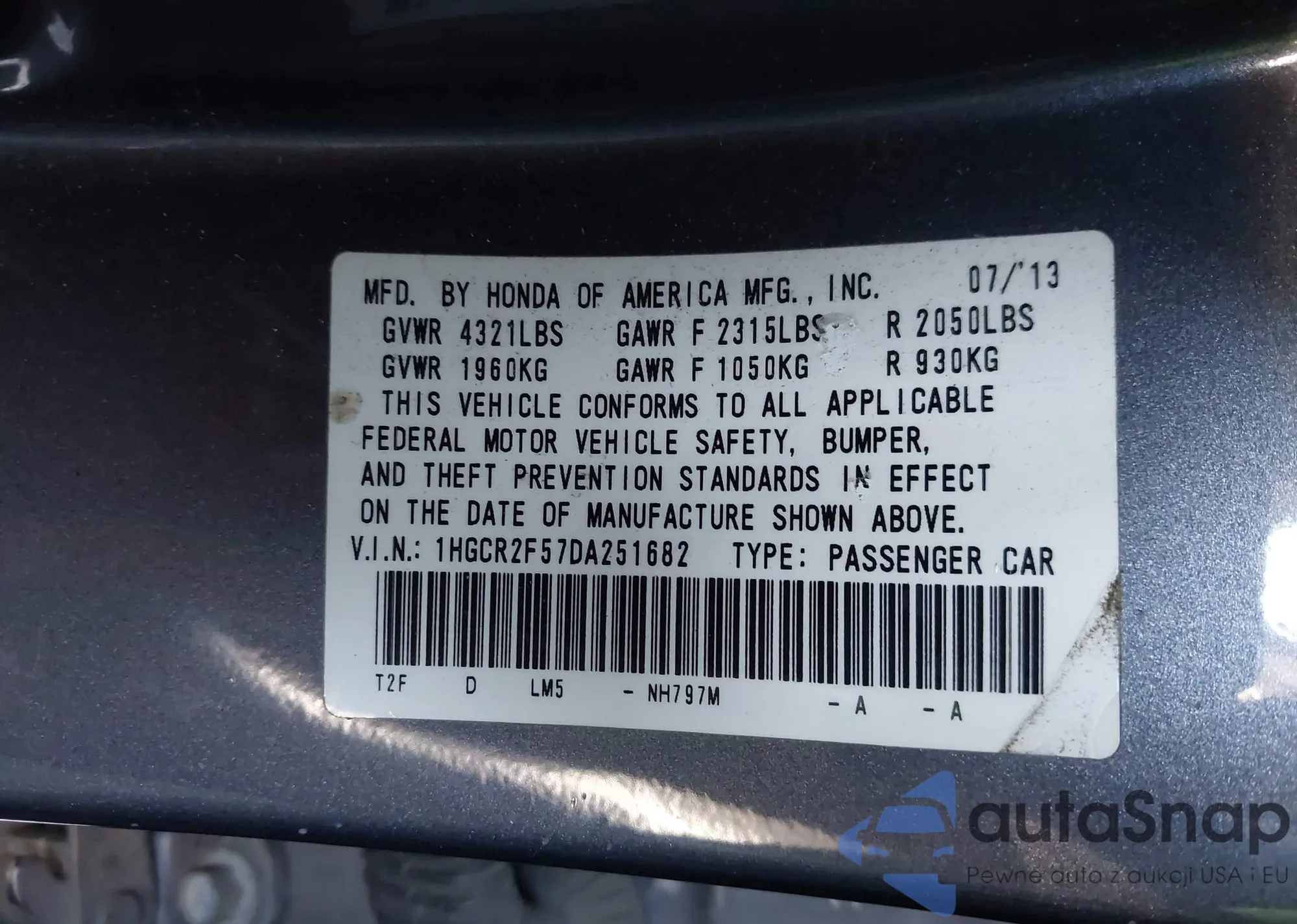 LOT: 42979331 VIN: 1HGCR2F57DA251682