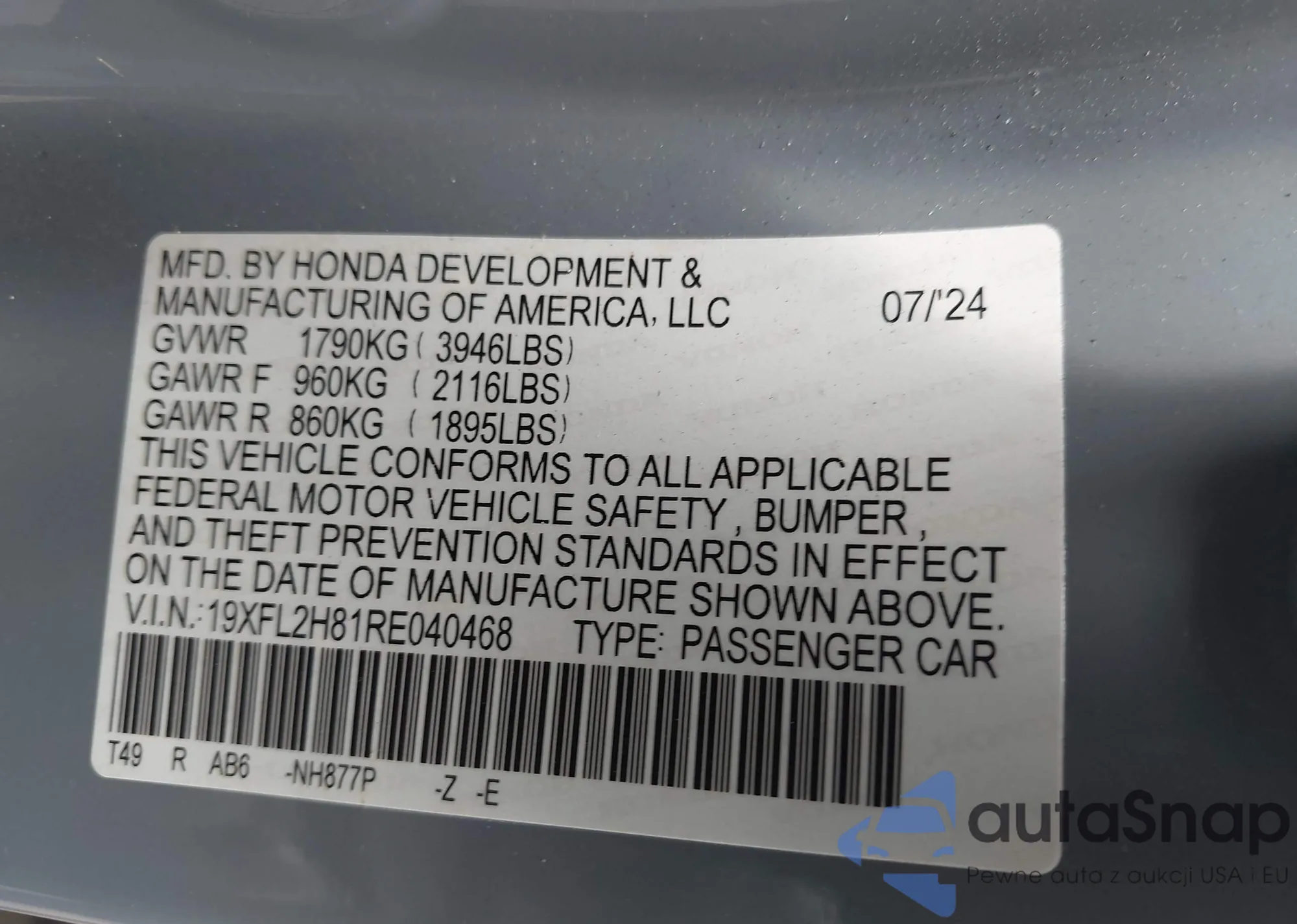 • VIN 19XFL2H81RE040468