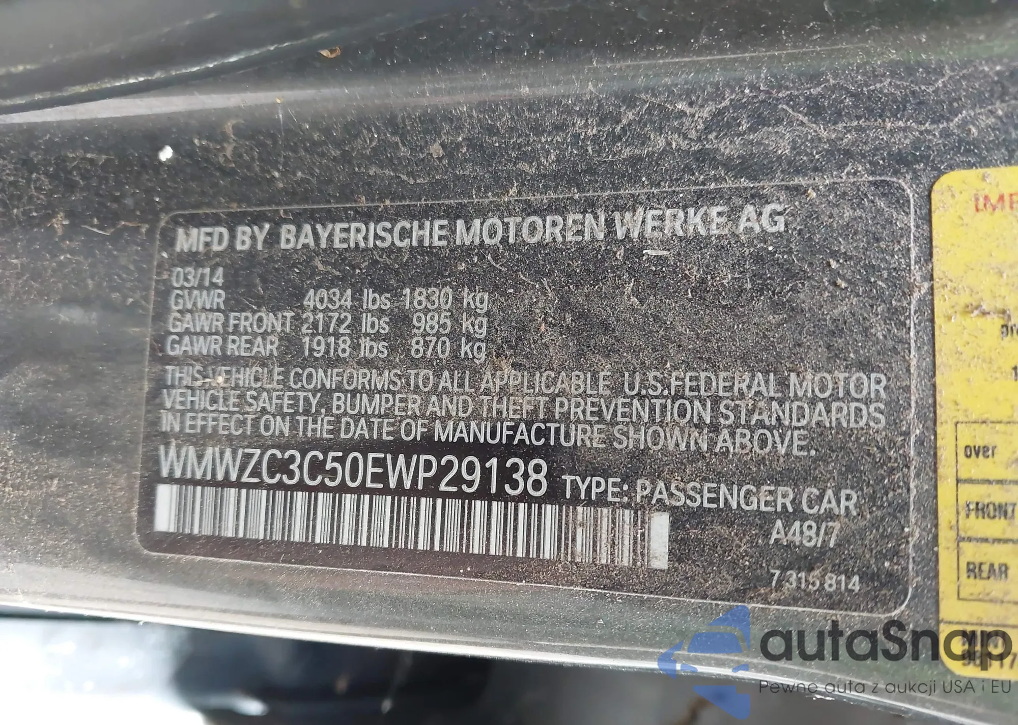 LOT: 42955782 VIN: WMWZC3C50EWP29138