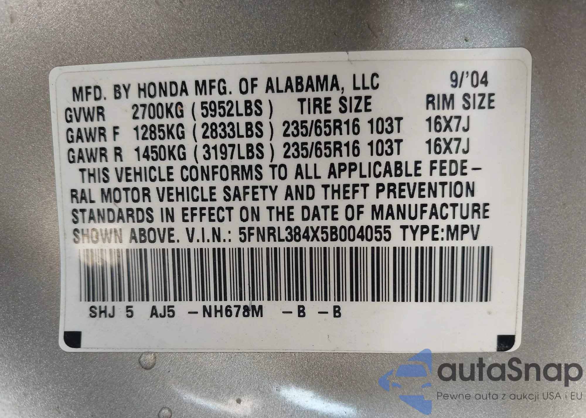 • VIN 5FNRL384X5B004055