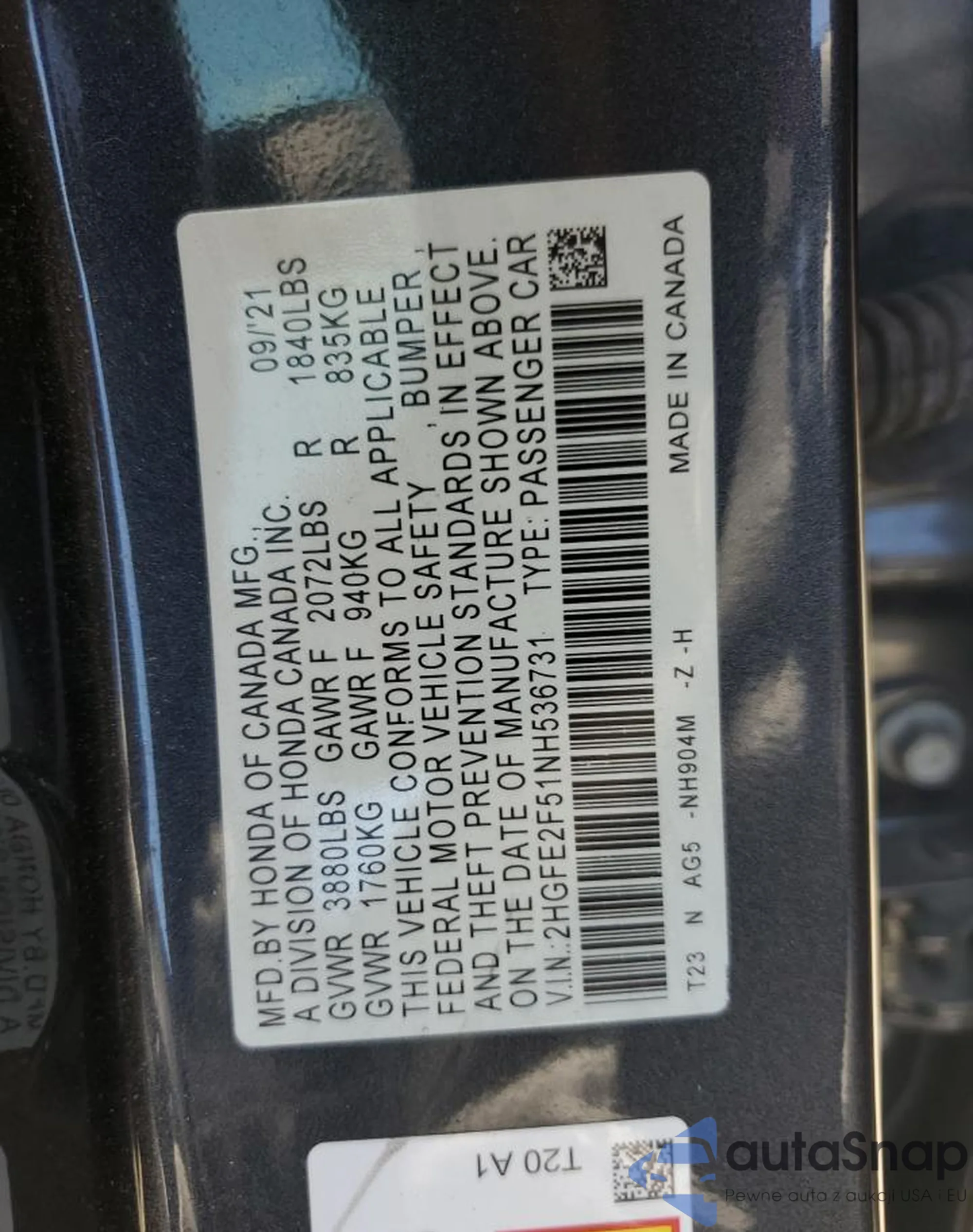 • VIN 2HGFE2F51NH536731