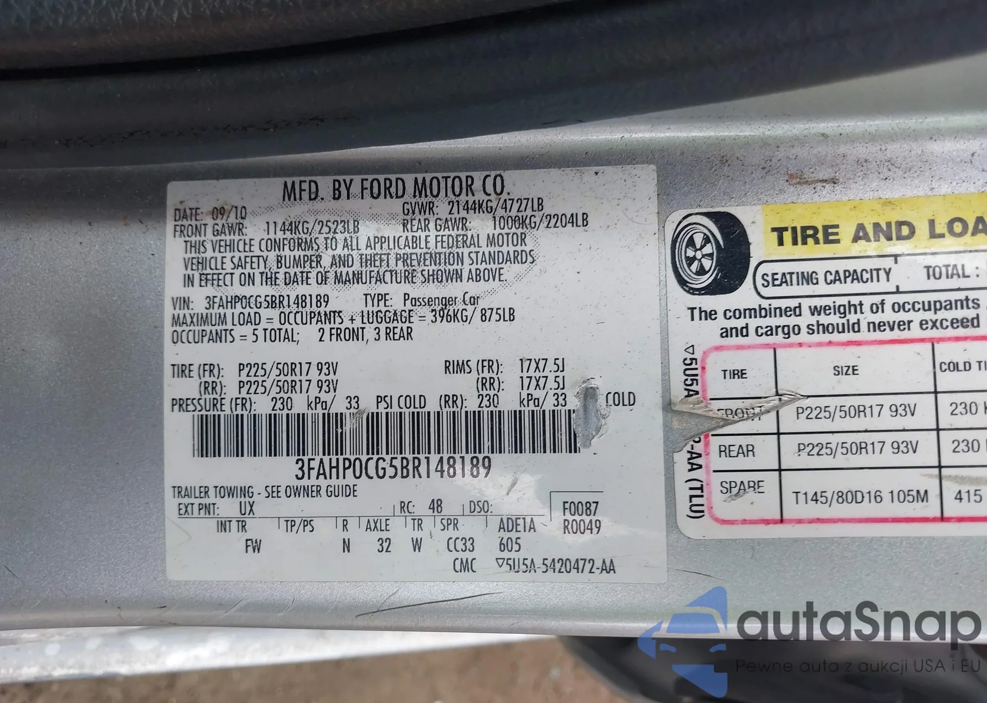 LOT: 42942839 VIN: 3FAHP0CG5BR148189
