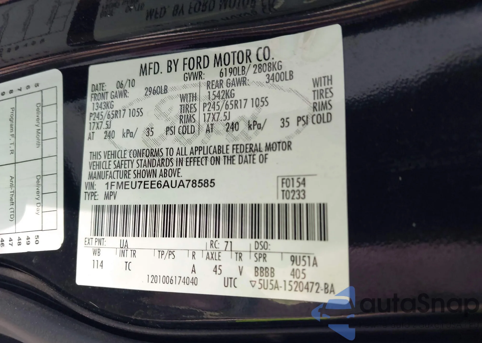 • VIN 1FMEU7EE6AUA78585