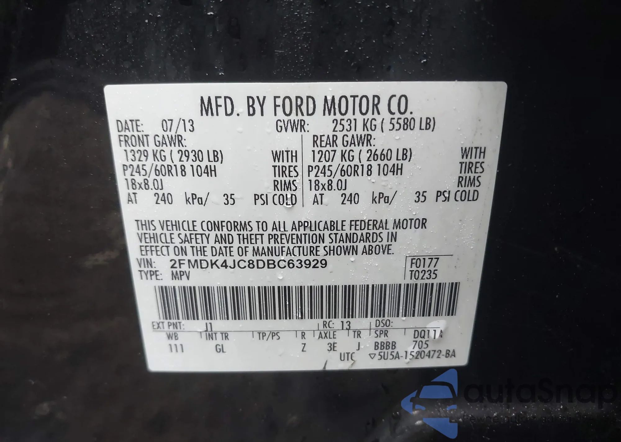 LOT: 43154470 VIN: 2FMDK4JC8DBC63929
