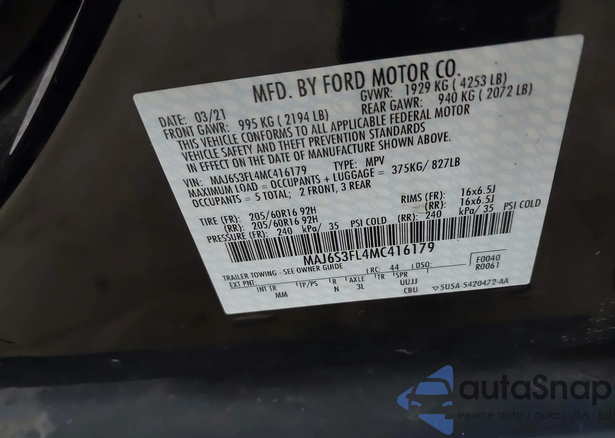 LOT: 42838063 VIN: MAJ6S3FL4MC416179