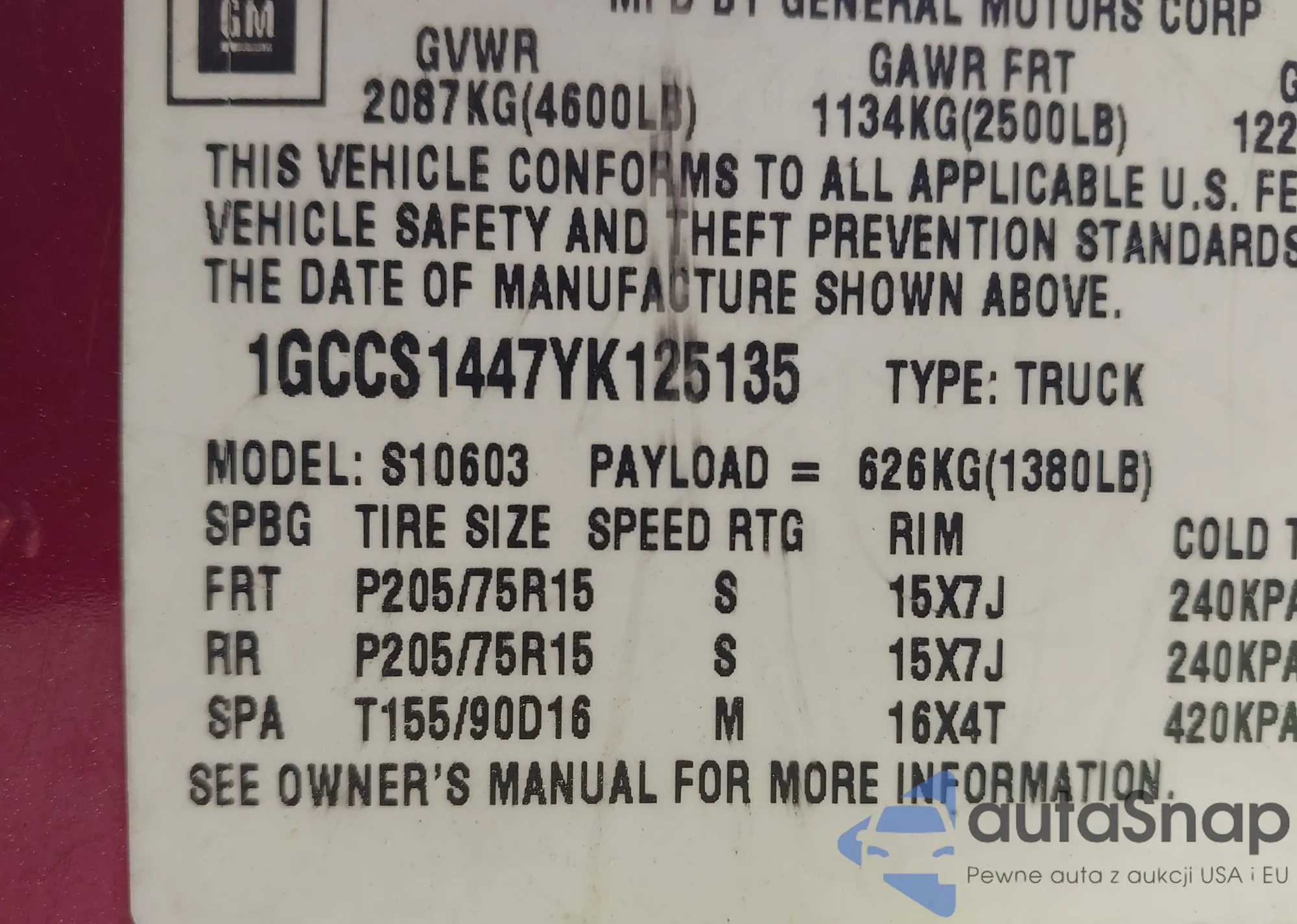 LOT: 43146315 VIN: 1GCCS1447YK125135