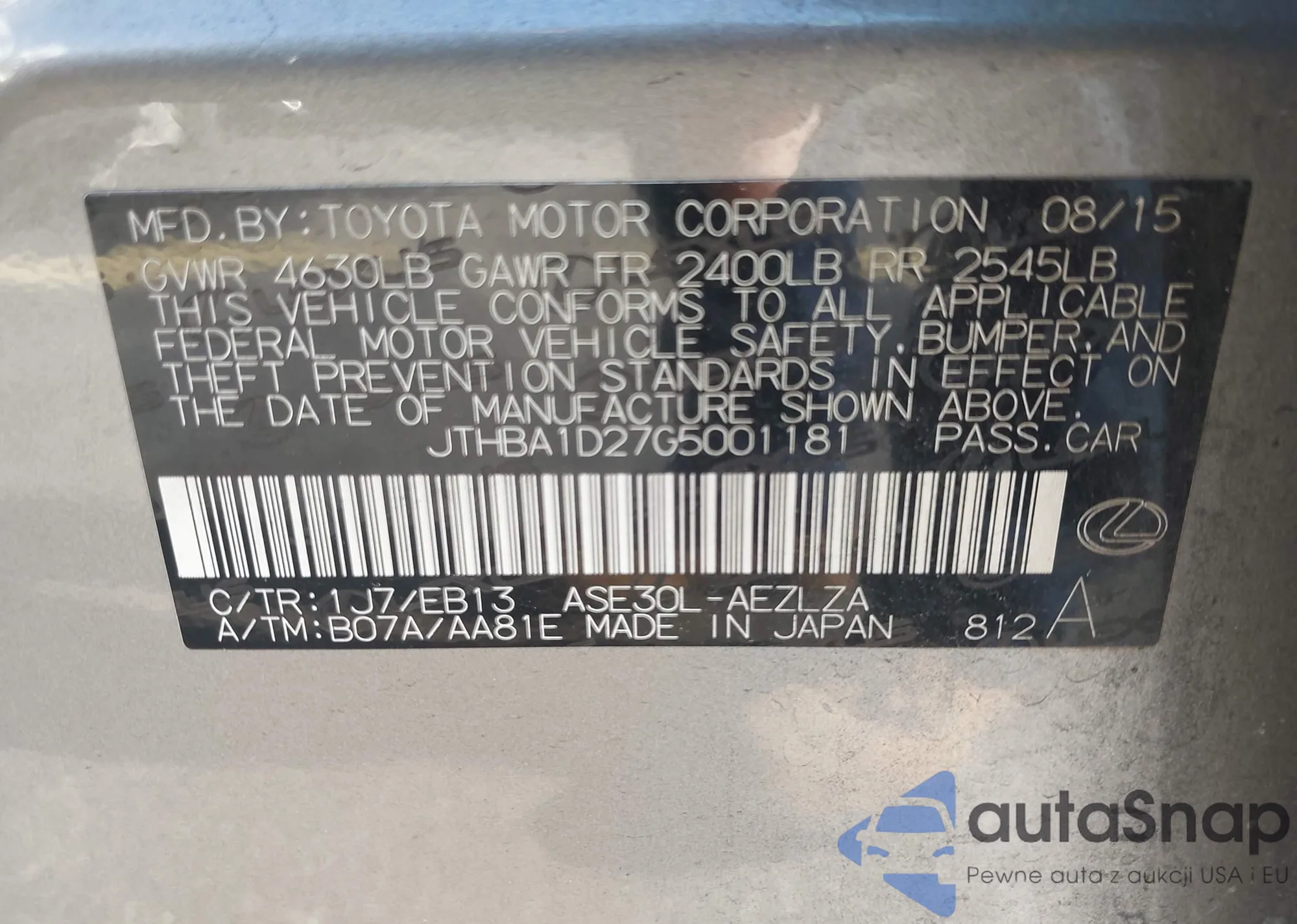 LOT: 42959327 VIN: JTHBA1D27G5001181
