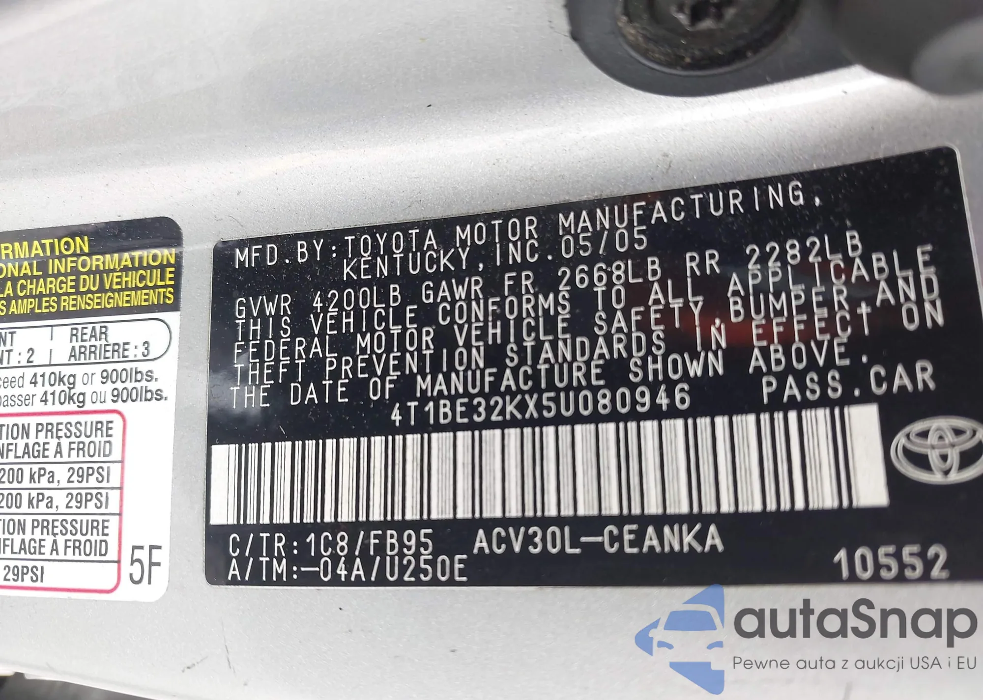• VIN 4T1BE32KX5U080946