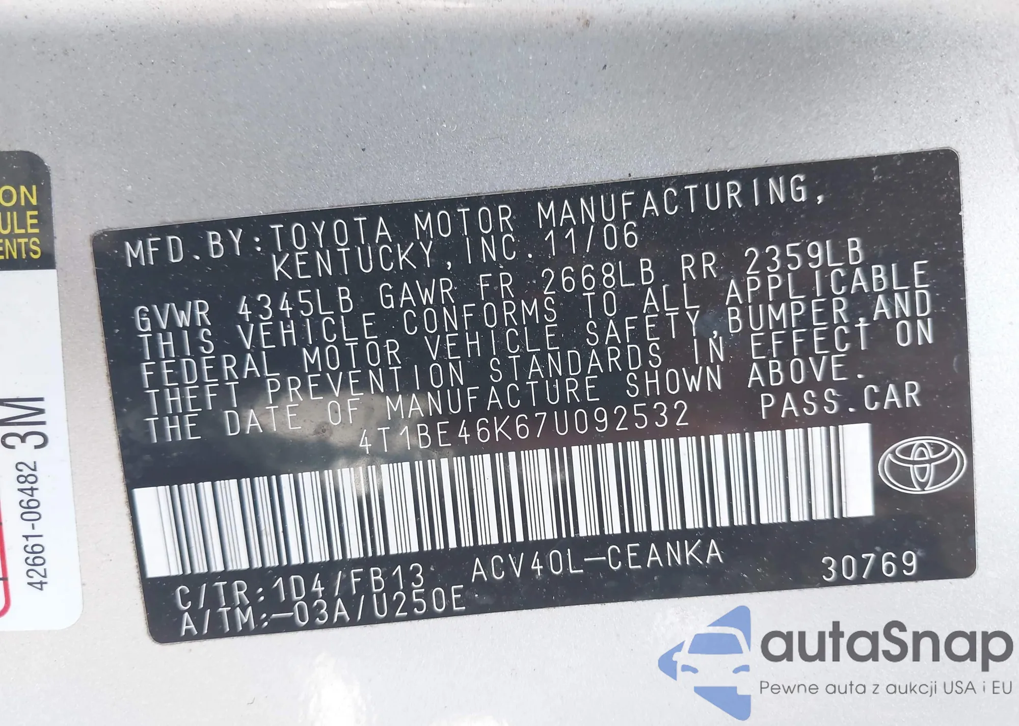 LOT: 43167405 VIN: 4T1BE46K67U092532