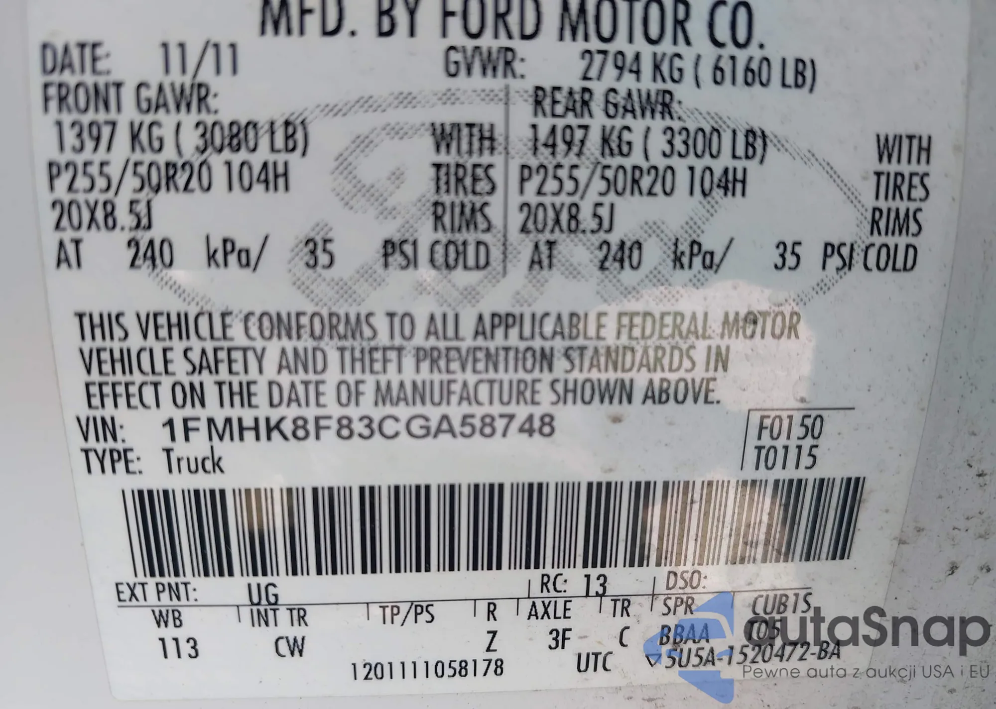 LOT: 42853163 VIN: 1FMHK8F83CGA58748