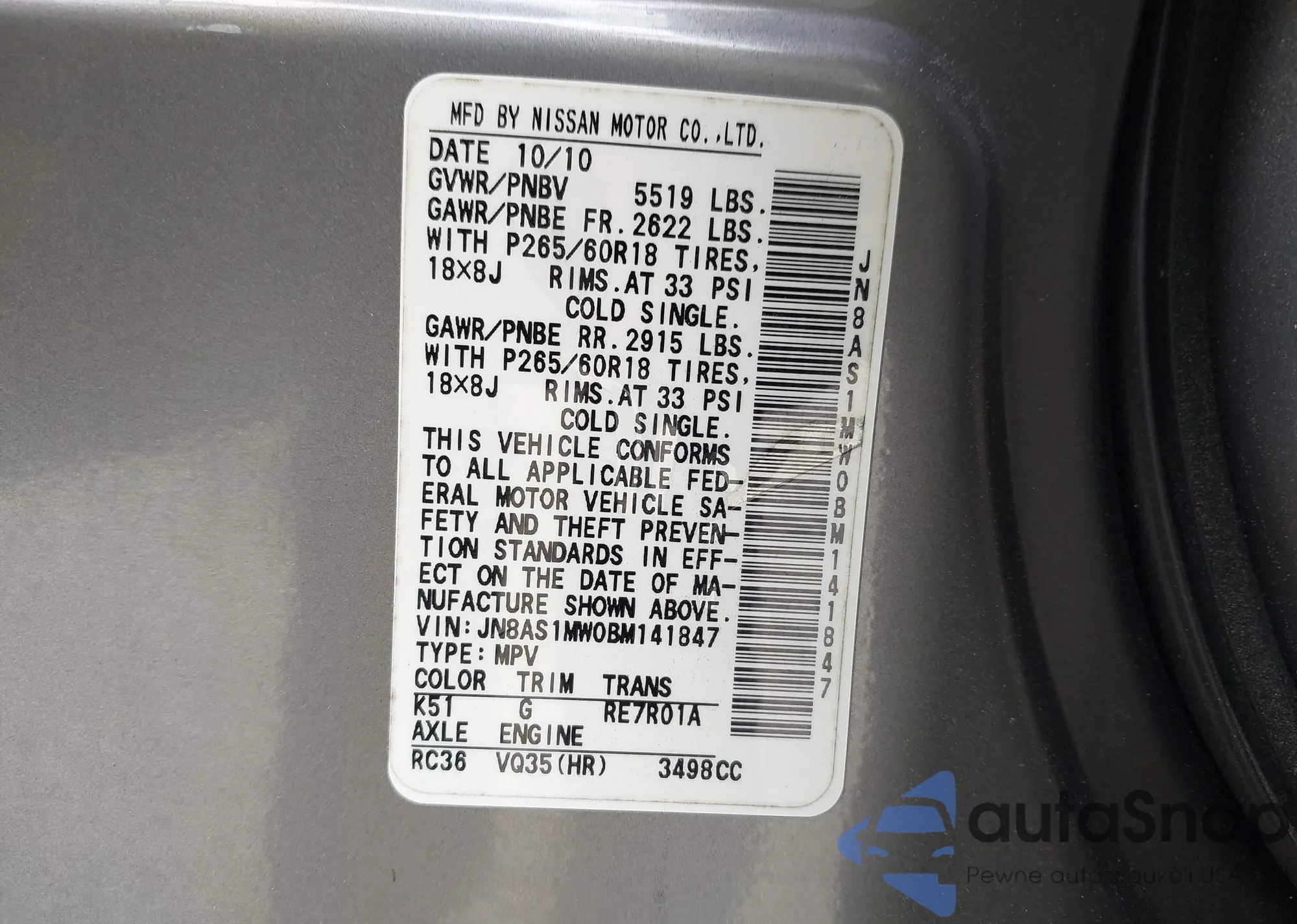 • VIN JN8AF5MV0ET364189