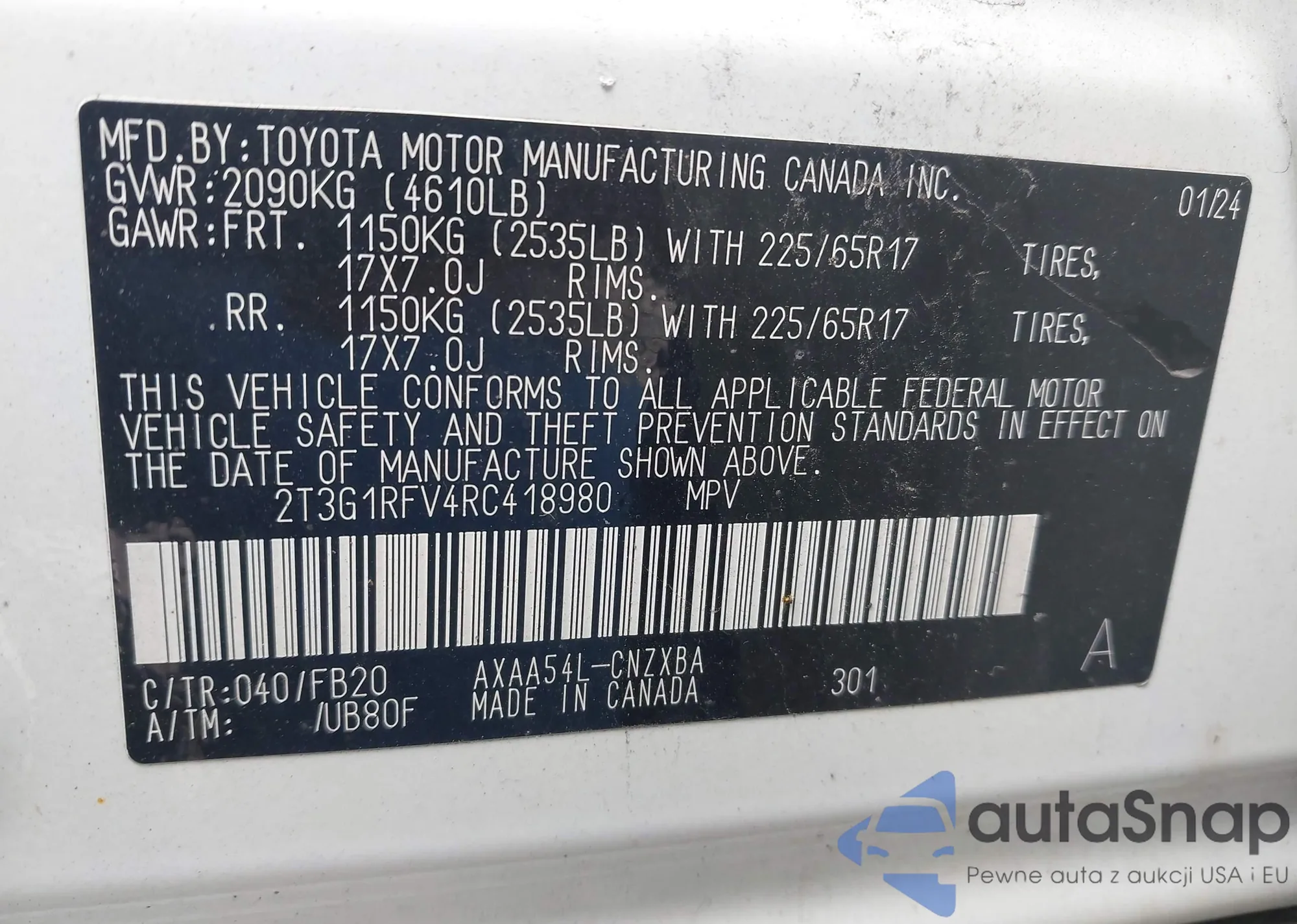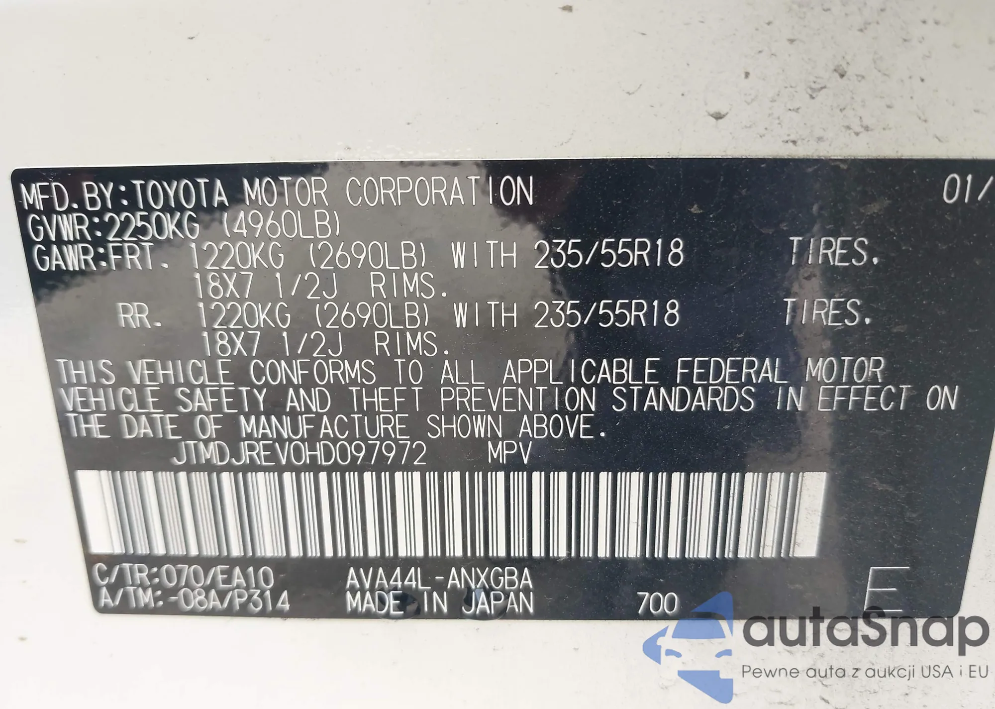 LOT: 42300992 VIN: JTMDJREV0HD097972