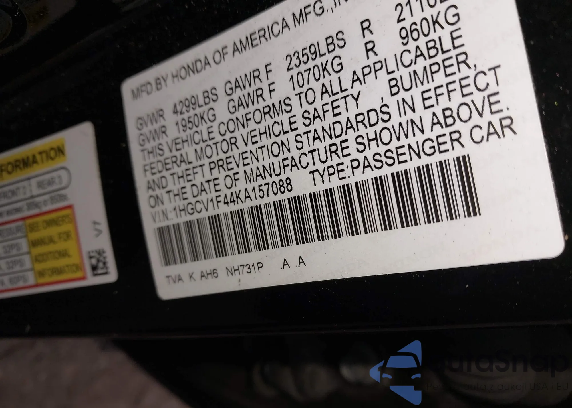 • VIN 1HGCV1F44KA157088