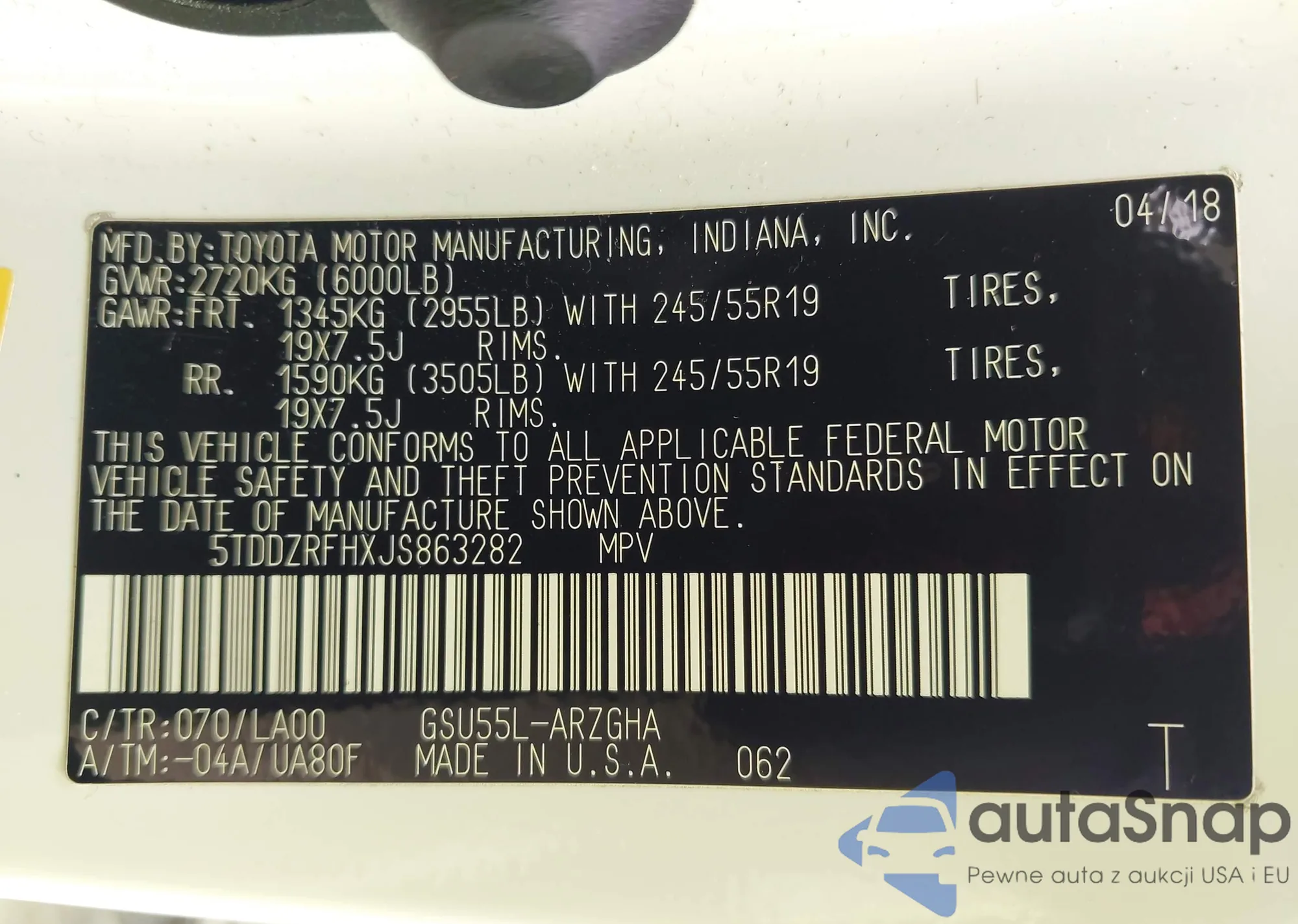 LOT: 42917706 VIN: 5TDDZRFHXJS863282