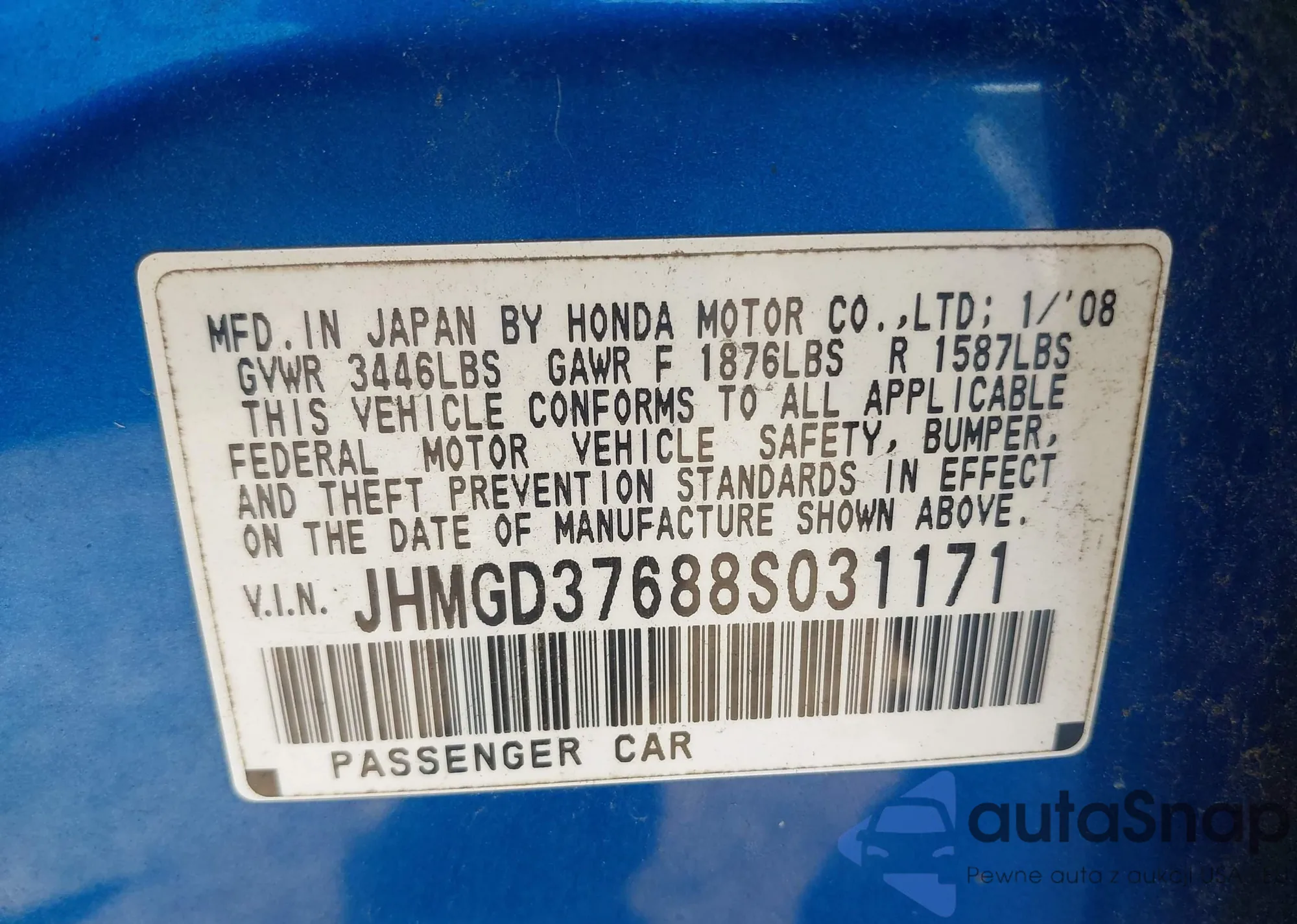 LOT: 42947058 VIN: JHMGD37688S031171