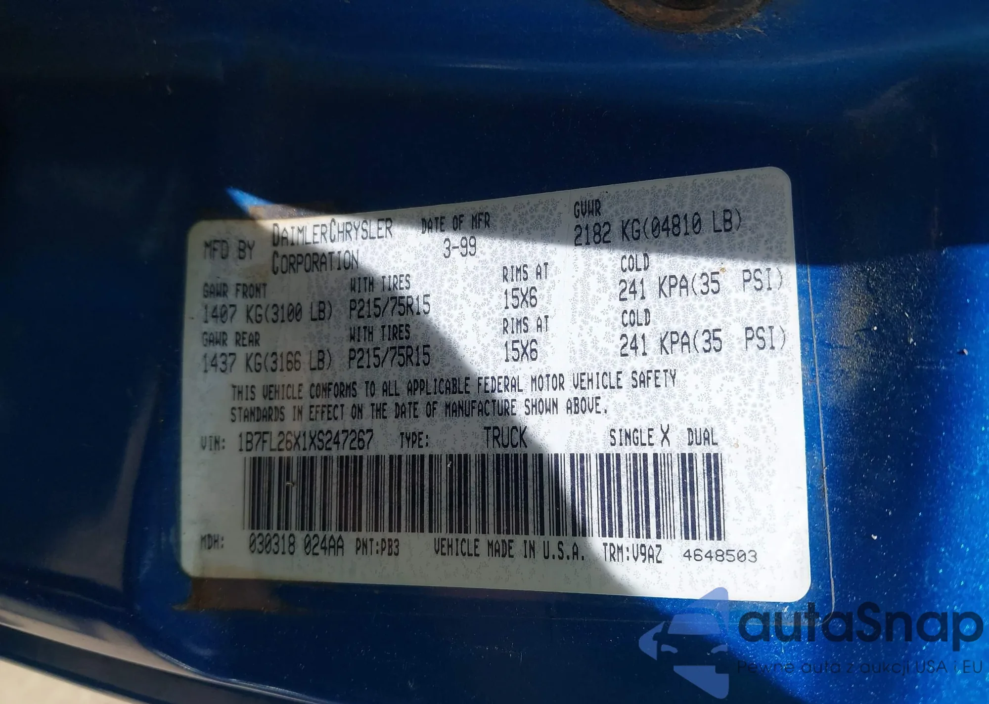 LOT: 43113508 VIN: 1B7FL26X1XS247267