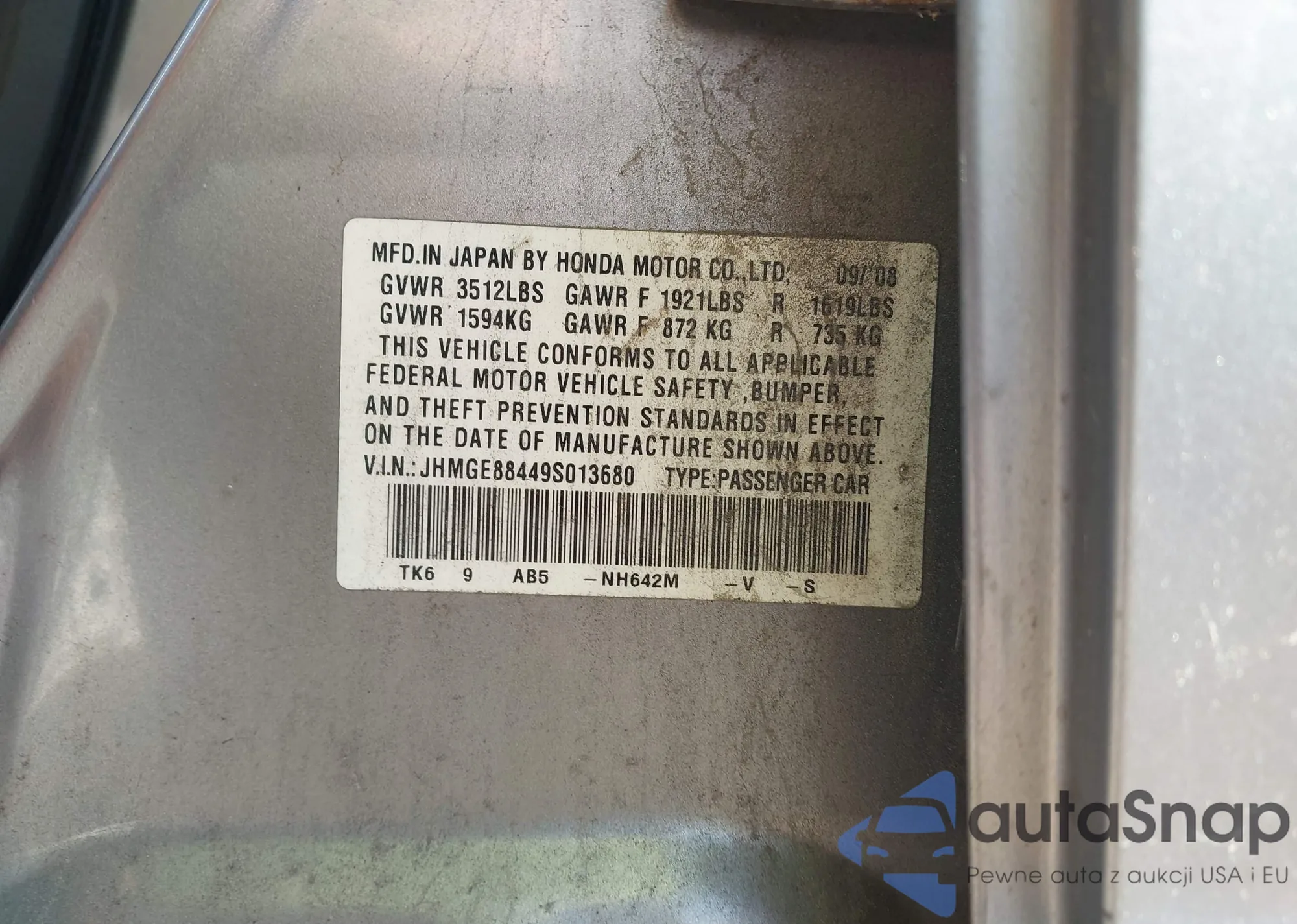 LOT: 43127780 VIN: JHMGE88449S013680