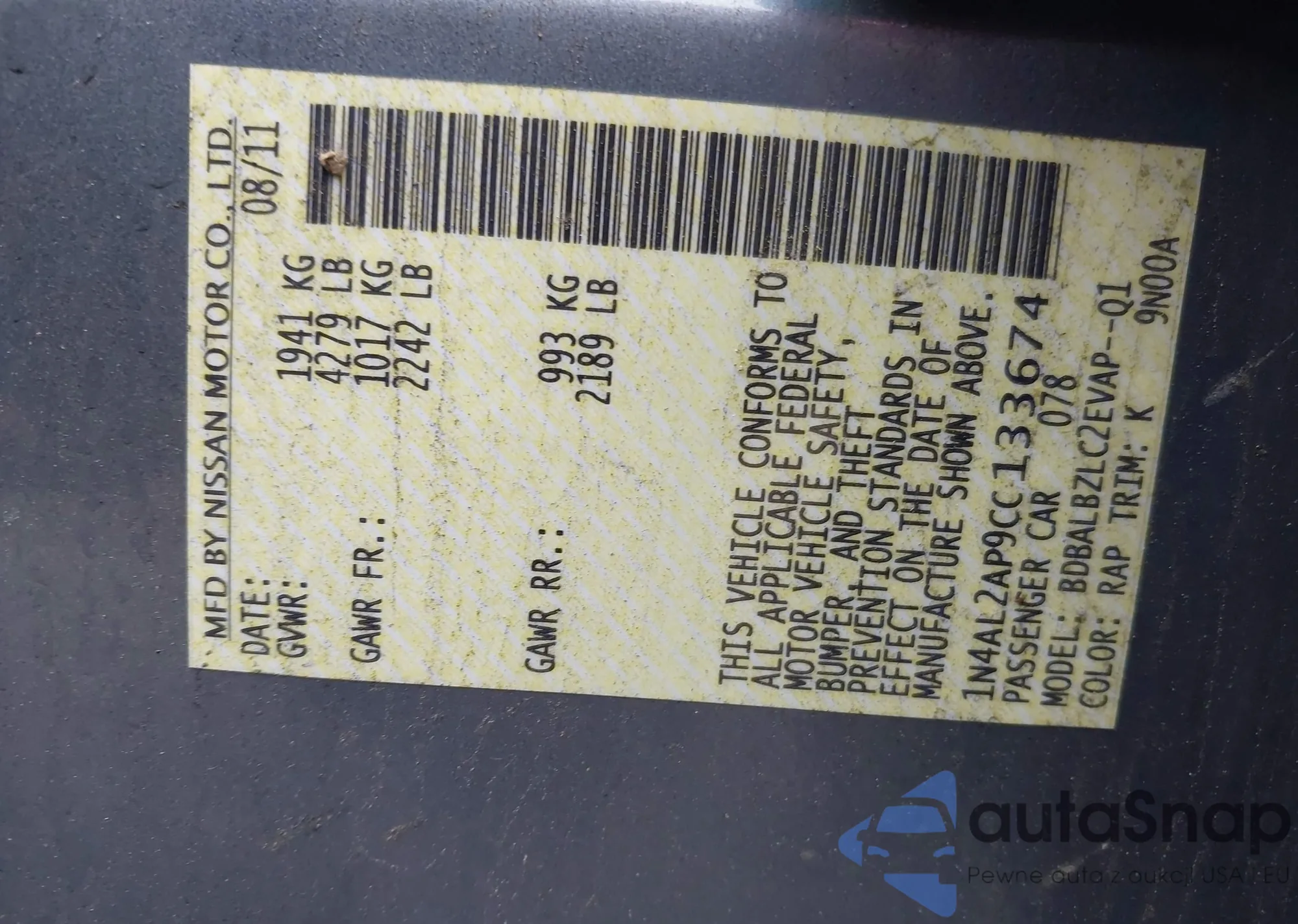 LOT: 42501849 VIN: 1N4AL2AP9CC133674