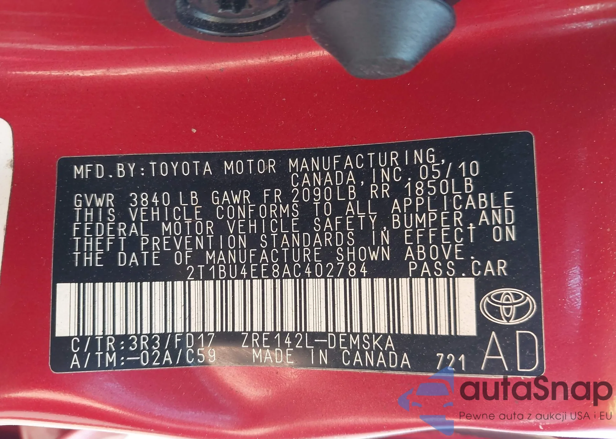 • VIN 2T1BU4EE8AC402784