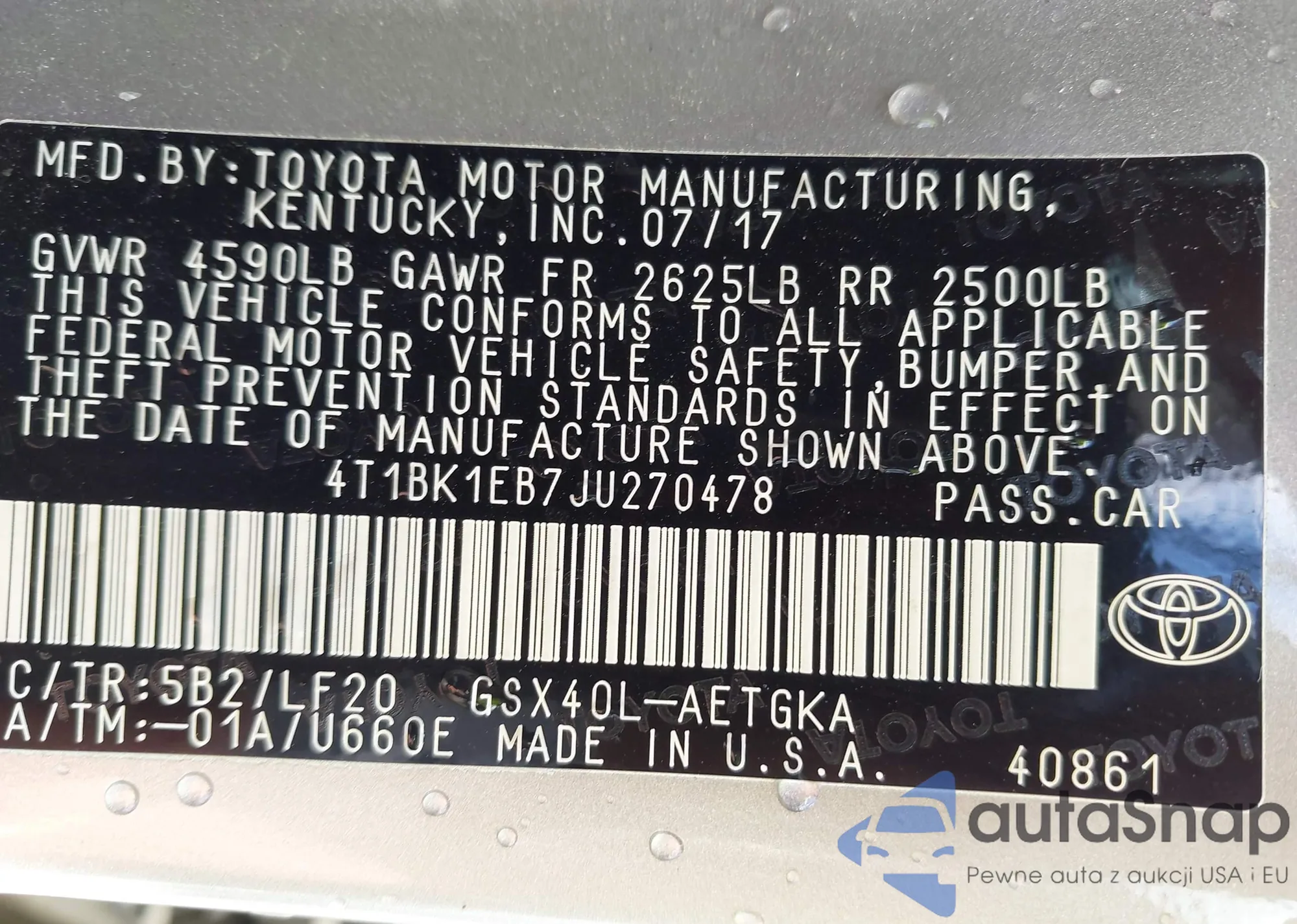 LOT: 42928377 VIN: 4T1B11HK2JU678563