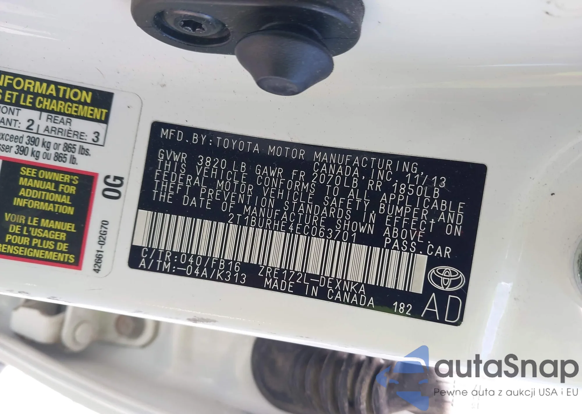 LOT: 42814446 VIN: 2T1BURHE4EC063701