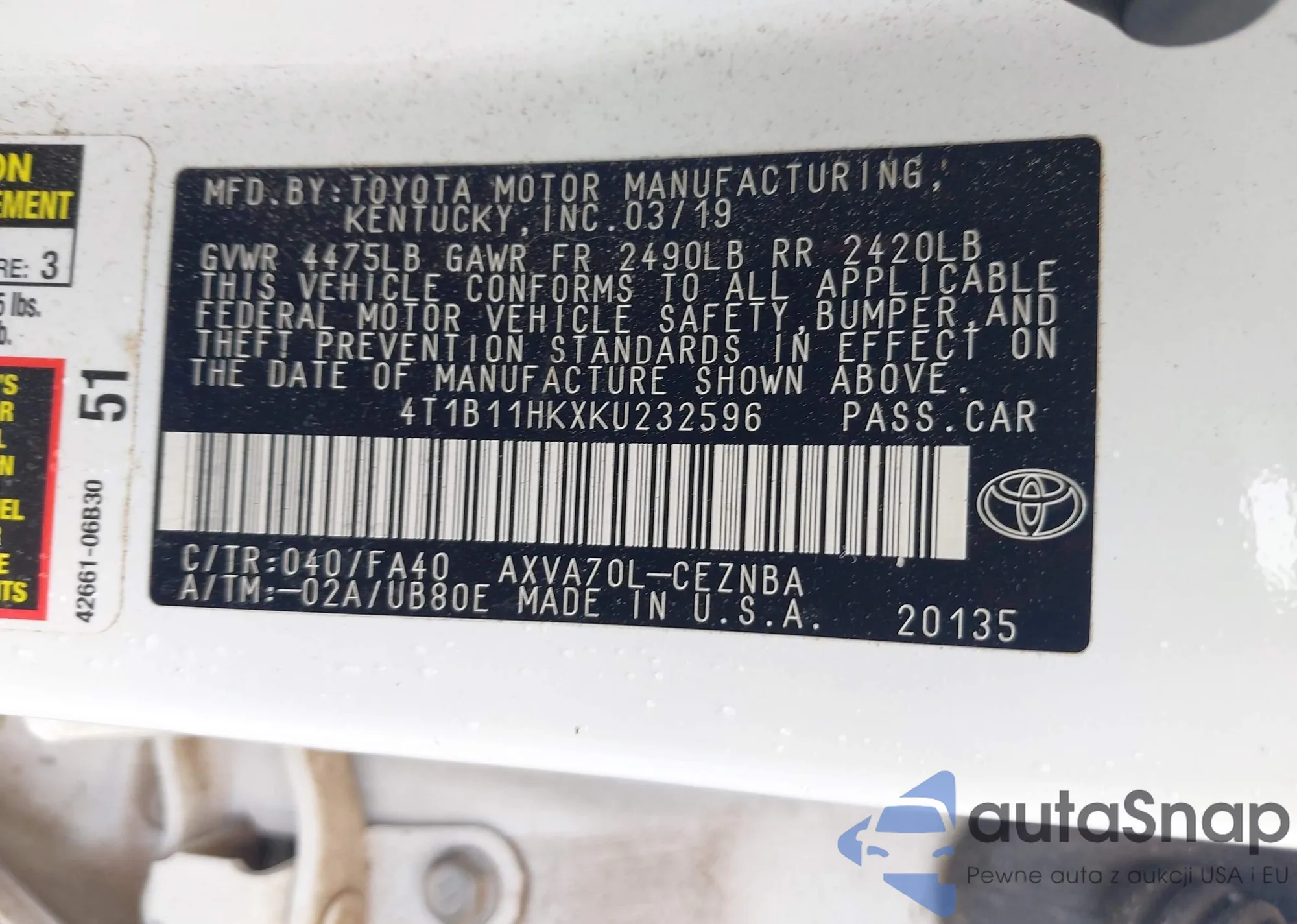 LOT: 42904717 VIN: 4T1B11HKXKU232596